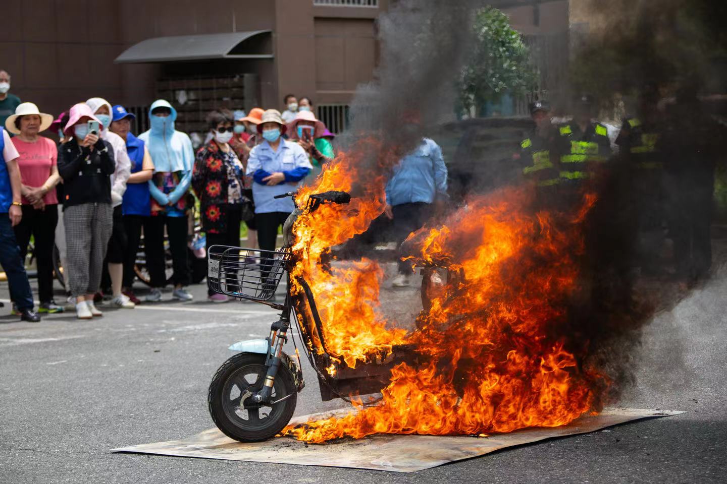 在小区一处空旷场地,不少小区居民在安全距离围观这堂“消防安全课”。现场,消防人员模拟电动自行车电池短路起火,在短短不到30秒时间里,明火就窜了出来,并迅速蔓延至电池及其他部件,同时伴随着阵阵浓烟。3分钟左右,电动自行车迅速被火舌吞并,进入猛烈燃烧状态,电池发出“啪、啪”的爆燃现象,同时释放令人窒息的有毒气体。5分钟左右,一辆原本可以正常行驶的电动自行车,被烧得只剩下了一具外壳,给现场观摩的居民留下了深刻的印象。