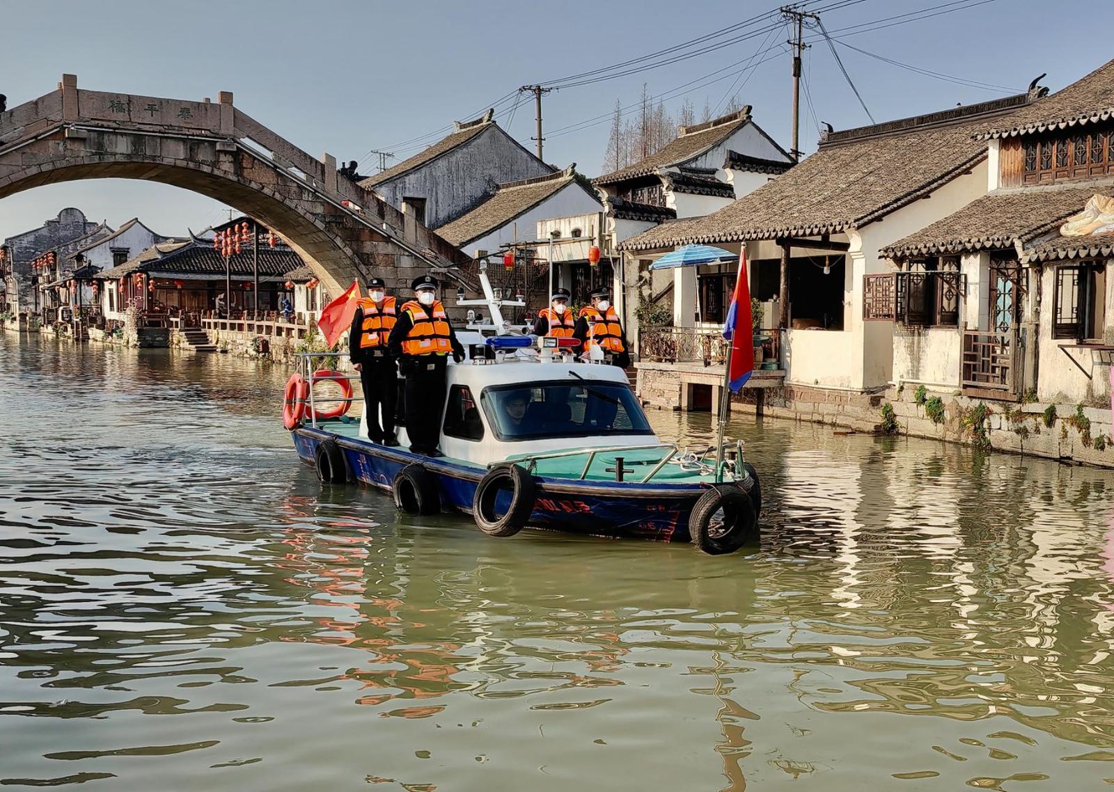 民警和消防人员在枫泾古镇水路区域进行巡逻。警方供图