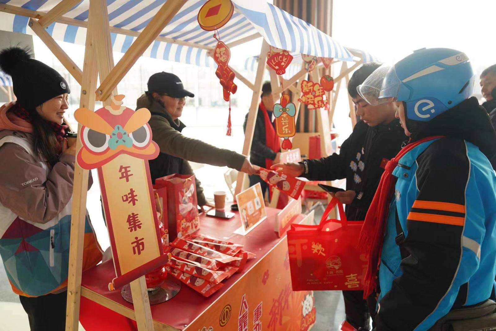 头图为新年集市上,骑手领福袋。劳动报记者贡俊祺 摄影