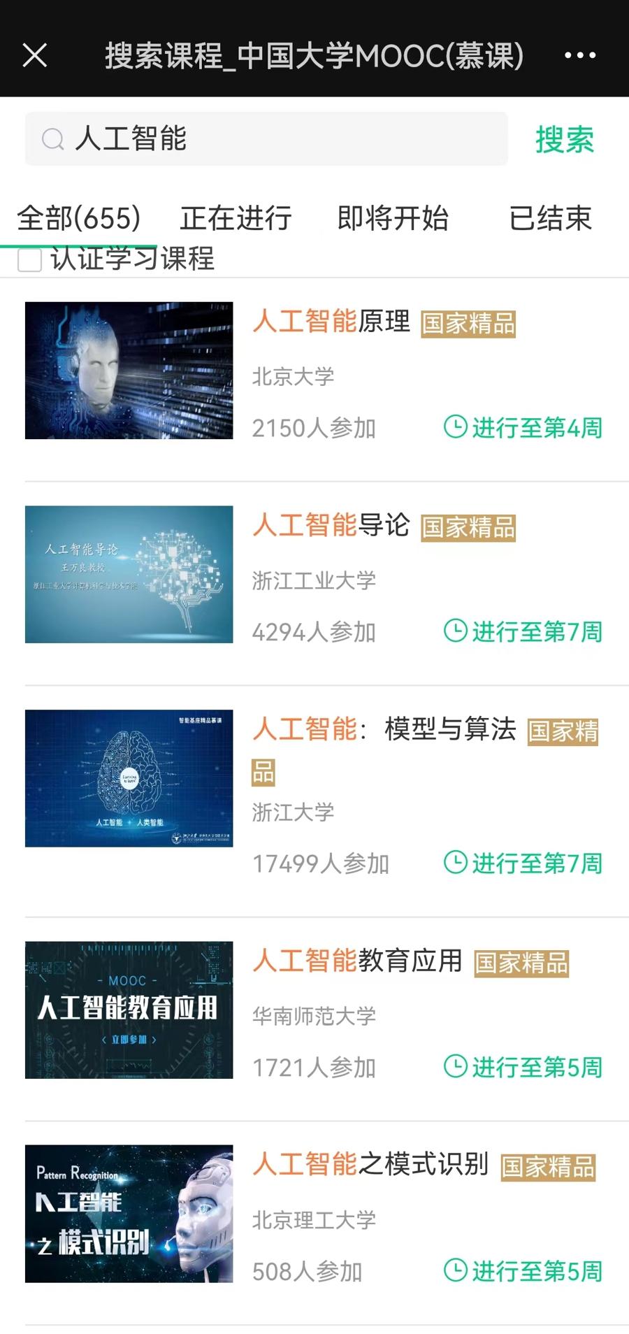 在中国大学MOOC慕课平台上,搜索“人工智能”,出现655个相关课程。
