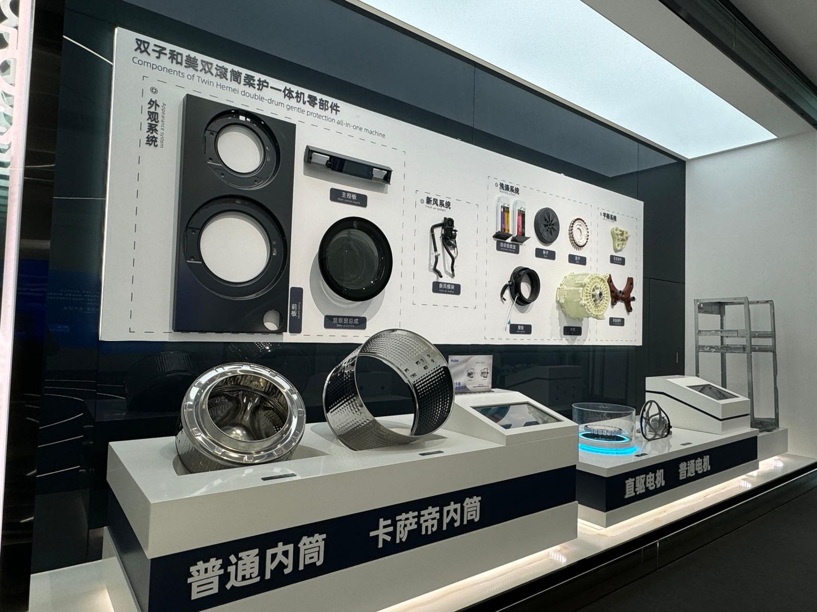 海尔上海洗衣机互联工厂展出的海尔洗衣机零部件。李美慧 摄影