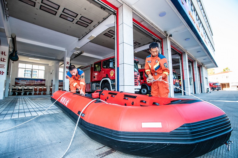 头图为消防人员正在调试冲锋舟。金山消防供图