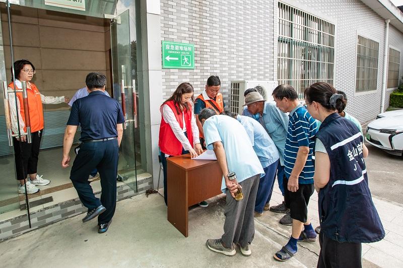 展开台风应对演练,对居民进行安全转移登记。金山消防供图