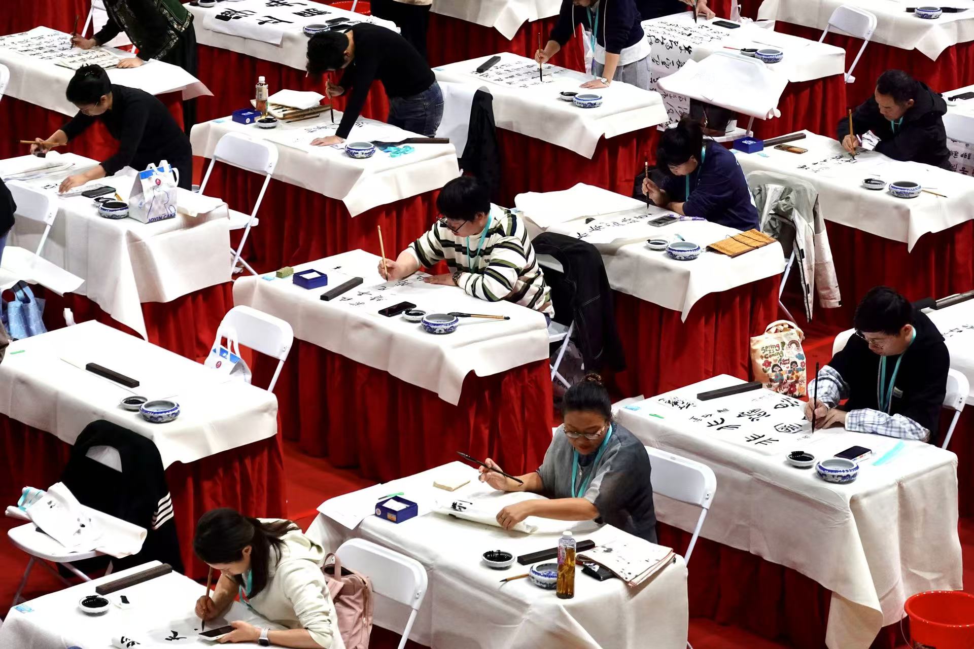参赛老师现场写书法。劳动报记者 贡俊祺 摄影