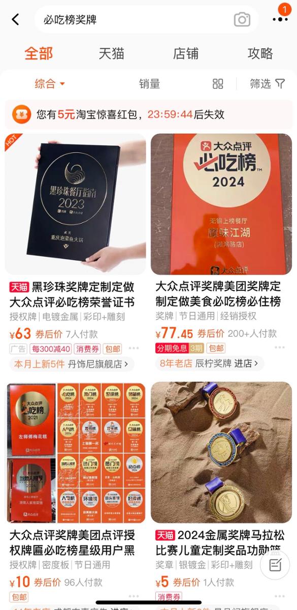 餐饮店的“流量密码”,竟隐藏在小小的奖牌制作店内?警方循线追踪,发现涉案的网店主营奖牌、奖杯制作,但同时也在销售该平台美食榜的证明牌匾。