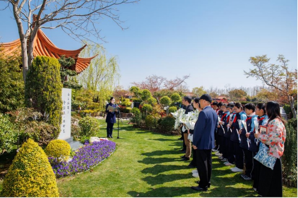 全场肃立,面向洁白的纪念碑默哀。所有来宾及学生代表们手捧鲜花,依次走到墓碑前献花,一朵朵鲜花承载着大家对傅雷先生的思念与缅怀。在庄重的氛围中,所有来宾向傅雷先生墓碑鞠躬致敬,表达着最真诚的敬意与最深切的思念和爱戴。