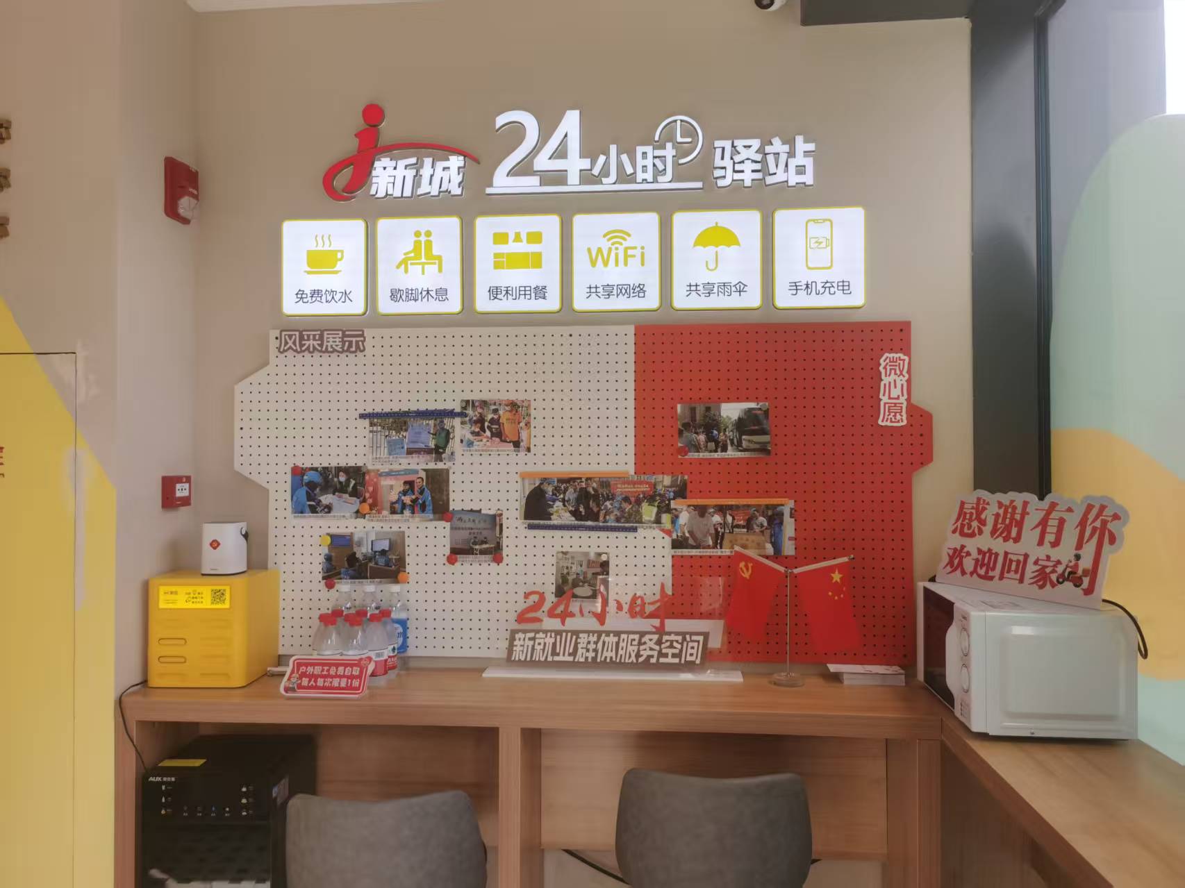“你可以说这里是驿站,也可以说它是我们骑手的一个家。”老成告诉记者,每到歇班的空档时,他就会来到驿站取瓶水喝,洗把脸擦汗,如果时间不急还能在这儿小憩一会。居委会办公室就在隔壁,这里带给他很强的安全感。