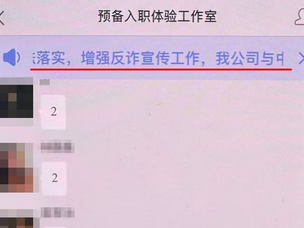 其后,当王女士临时开通的借款账号因额度受限无法提取更多钱款后,对方竟然又发来“在线反诈答题问卷”,让她认真答题通过测试以获取更多借款额度。更为讽刺的是,在所谓“试岗人员”的临时工作群内,对方还堂而皇之地置顶了“反诈宣传提醒”。