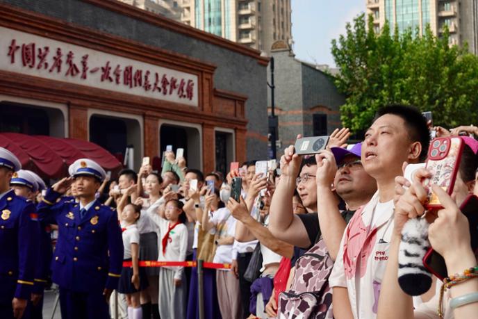 10月1日一早,党的诞生地已汇聚起满怀热忱的观众。系着红领巾的孩童、朝气蓬勃的青年、白发苍苍的老人手持小国旗,自觉列队等候。上午8点30分,随着一大广场国旗护卫队迈着铿锵有力的步伐,昂首走向升旗台,五星红旗冉冉升起,“从胜利走向胜利”——庆祝新中国成立76周年特别活动在一大广场拉开帷幕。