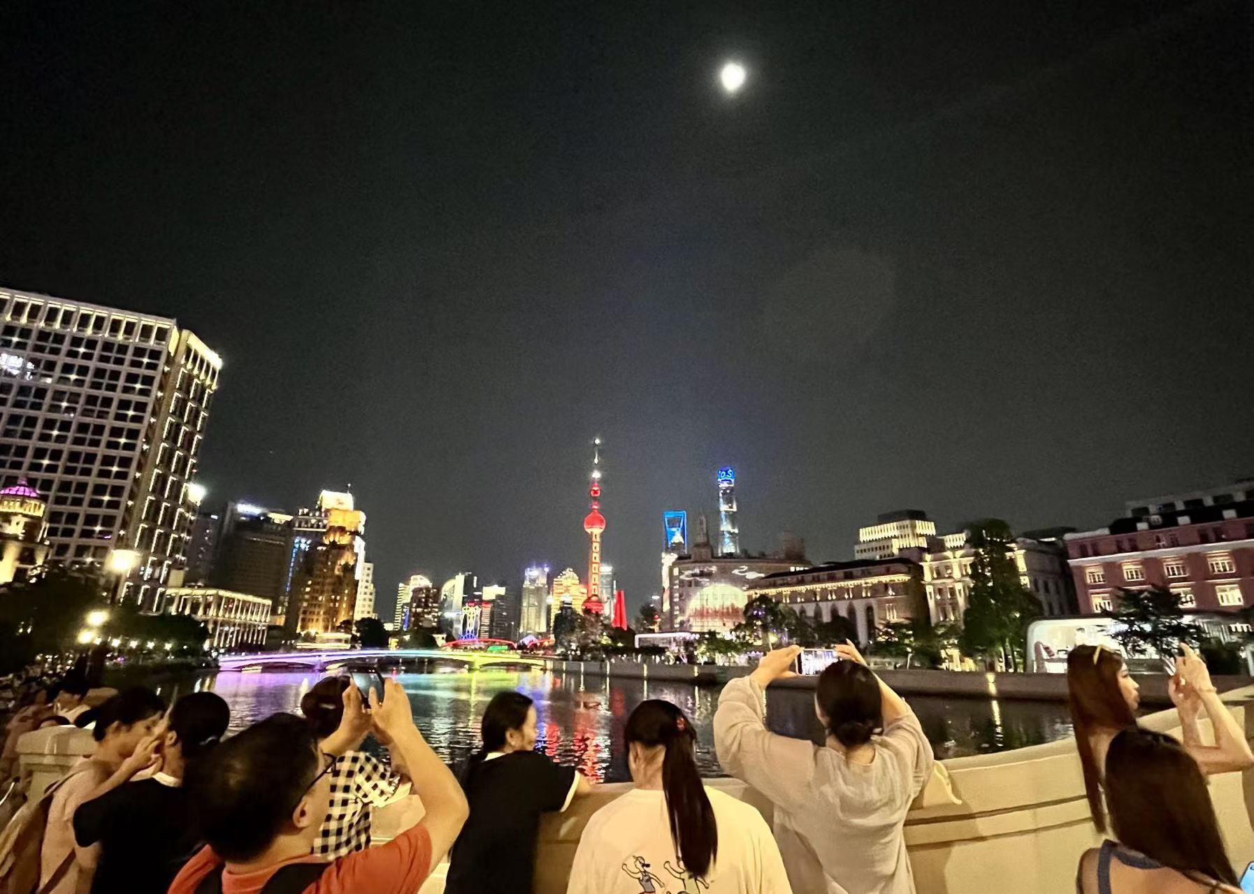 中秋佳节,恰逢国庆假期苏州河畔网红地标吸引了不少市民游客前来赏月打卡。同时还能欣赏到浦江两岸的灯光美景。