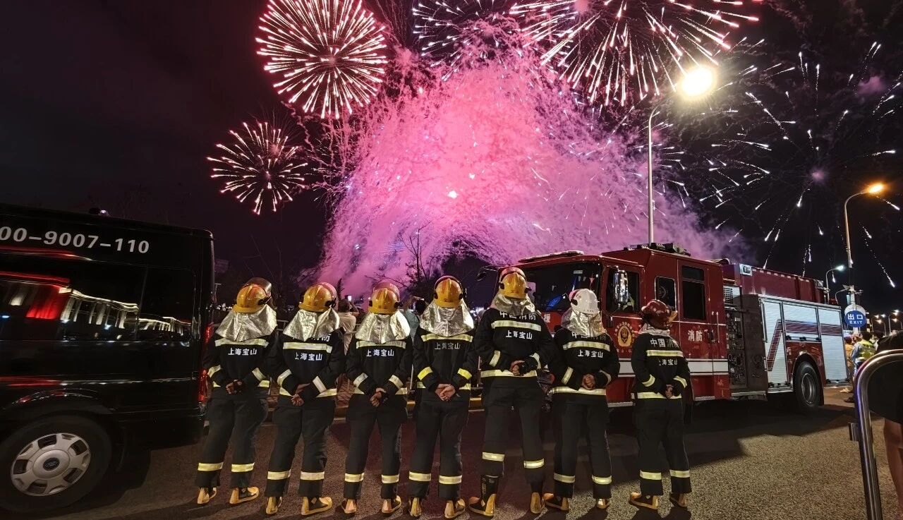 头图为宝山消防正在烟花秀现场进行安保执勤。消防部门供图