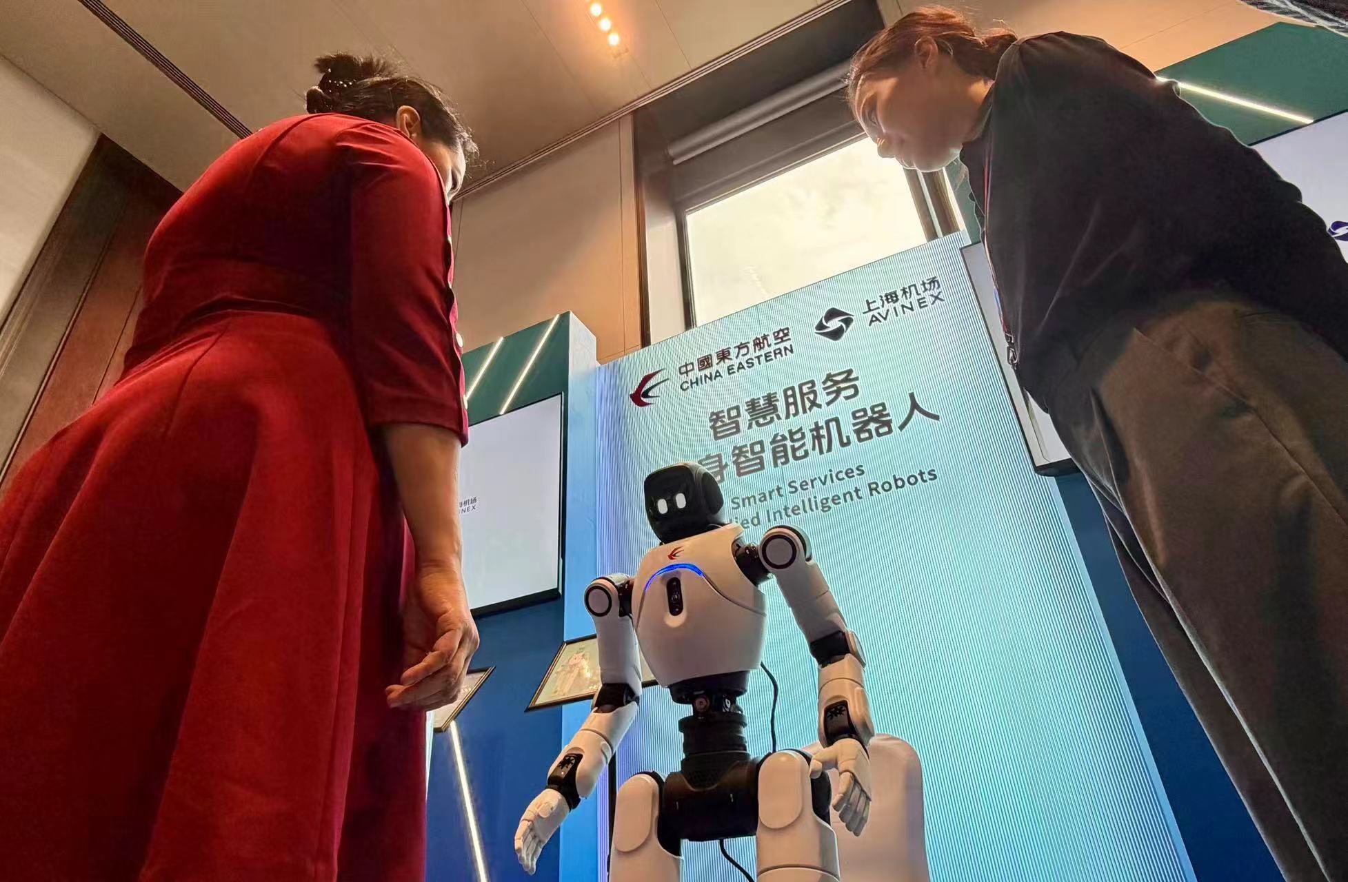 记者就在现场看到,东航展示的“空中丝路”航线网络数字化可视图景,发布了“数字人—多智能体”建设成果,其中包括数字客服“东东”和实体机器人“小东”等系列数字人,生动展现AI与航空服务的深度融合。