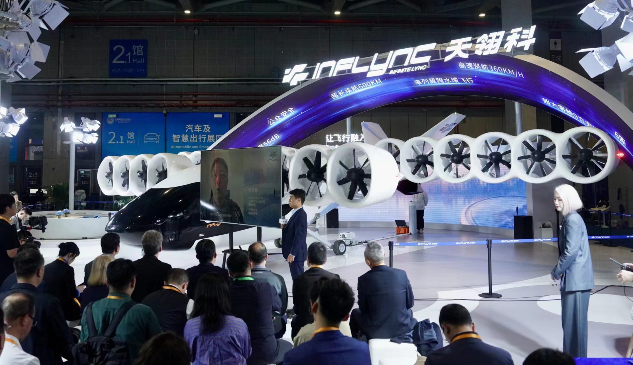 汽车及智慧出行展区酷炫来袭,全球首架全尺寸倾转涵道翼eVTOL——天翎科INFLYNC L600展台前围满了观众。劳动报记者贡俊祺 摄影