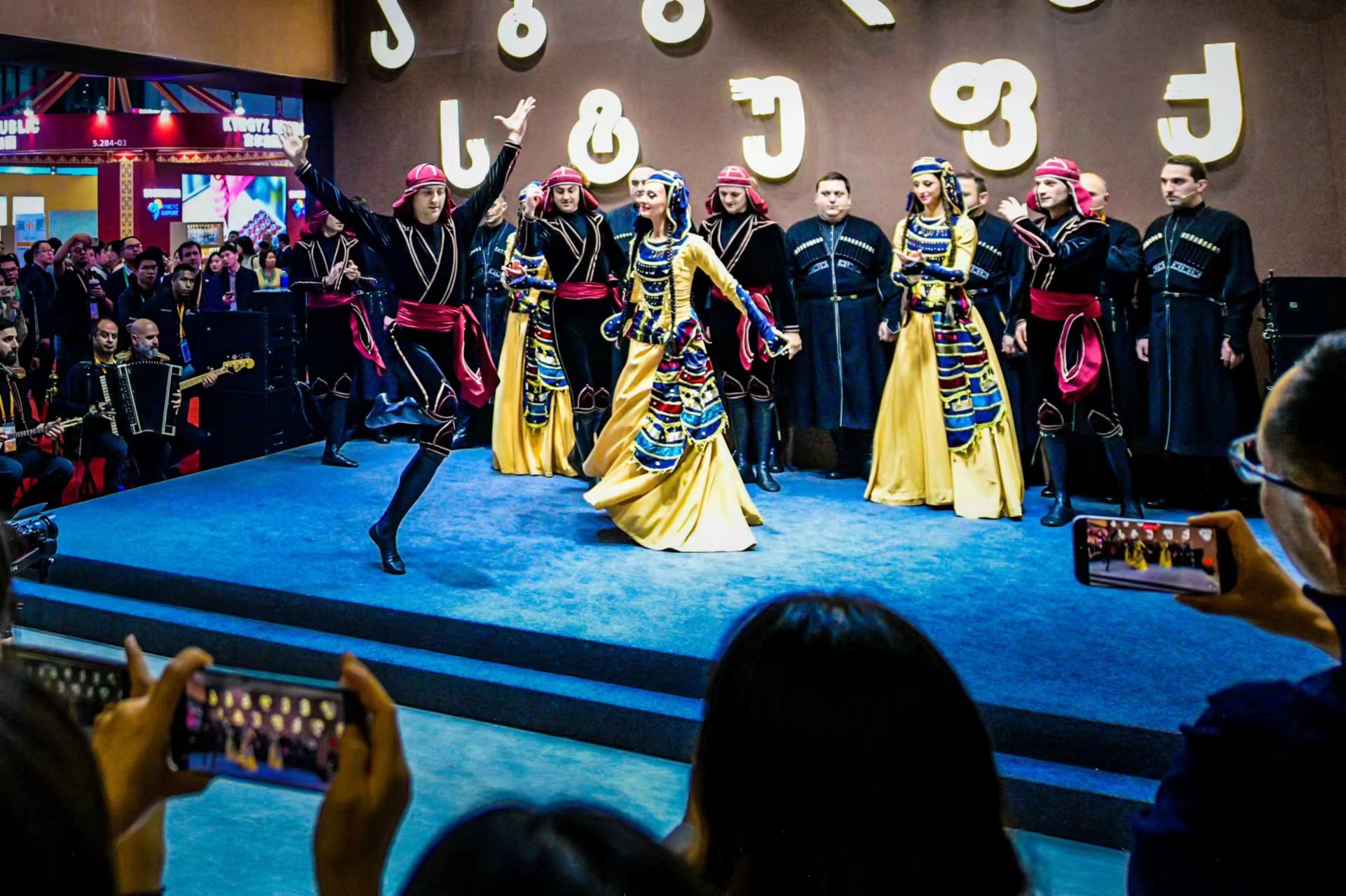 地处欧亚交汇处的格鲁吉亚今年首次以主宾国身份亮相进博会,艺术家们在国家展内跳起充满民族风情的舞蹈。劳动报记者颜筱依 摄影