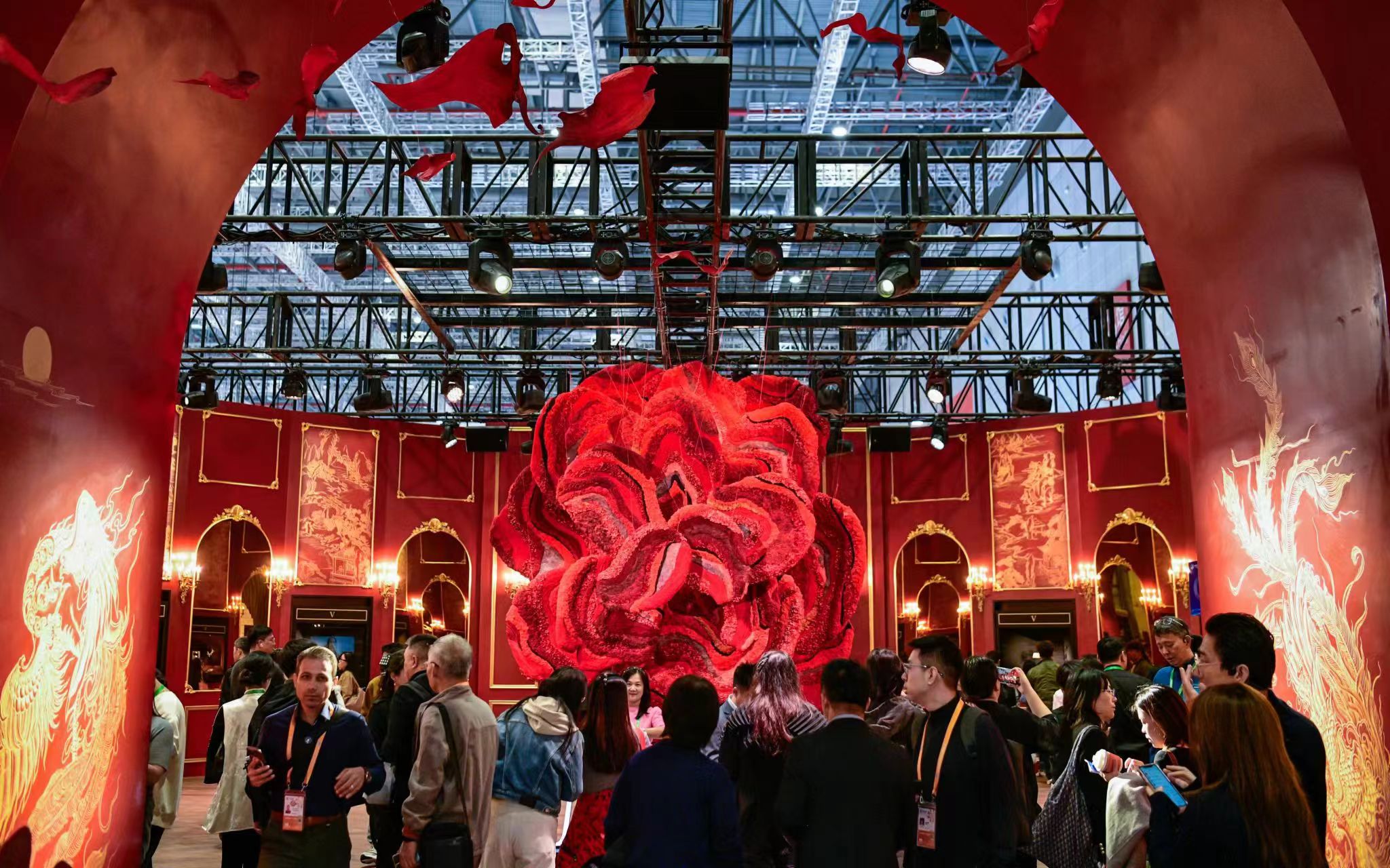 头图为几十位花艺师工作了数千小时制作而成的巨型花朵,在消费品展区V MUSE展台前吐露芬芳,吸引不少观众拍照打卡。劳动报记者颜筱依 摄影
