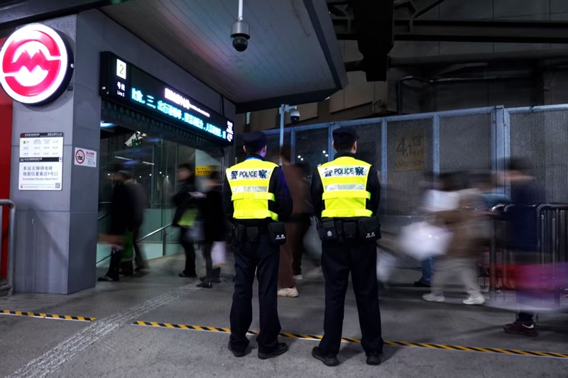 散场时分,民警驻守在轨交出入口保障客流秩序。警方供图