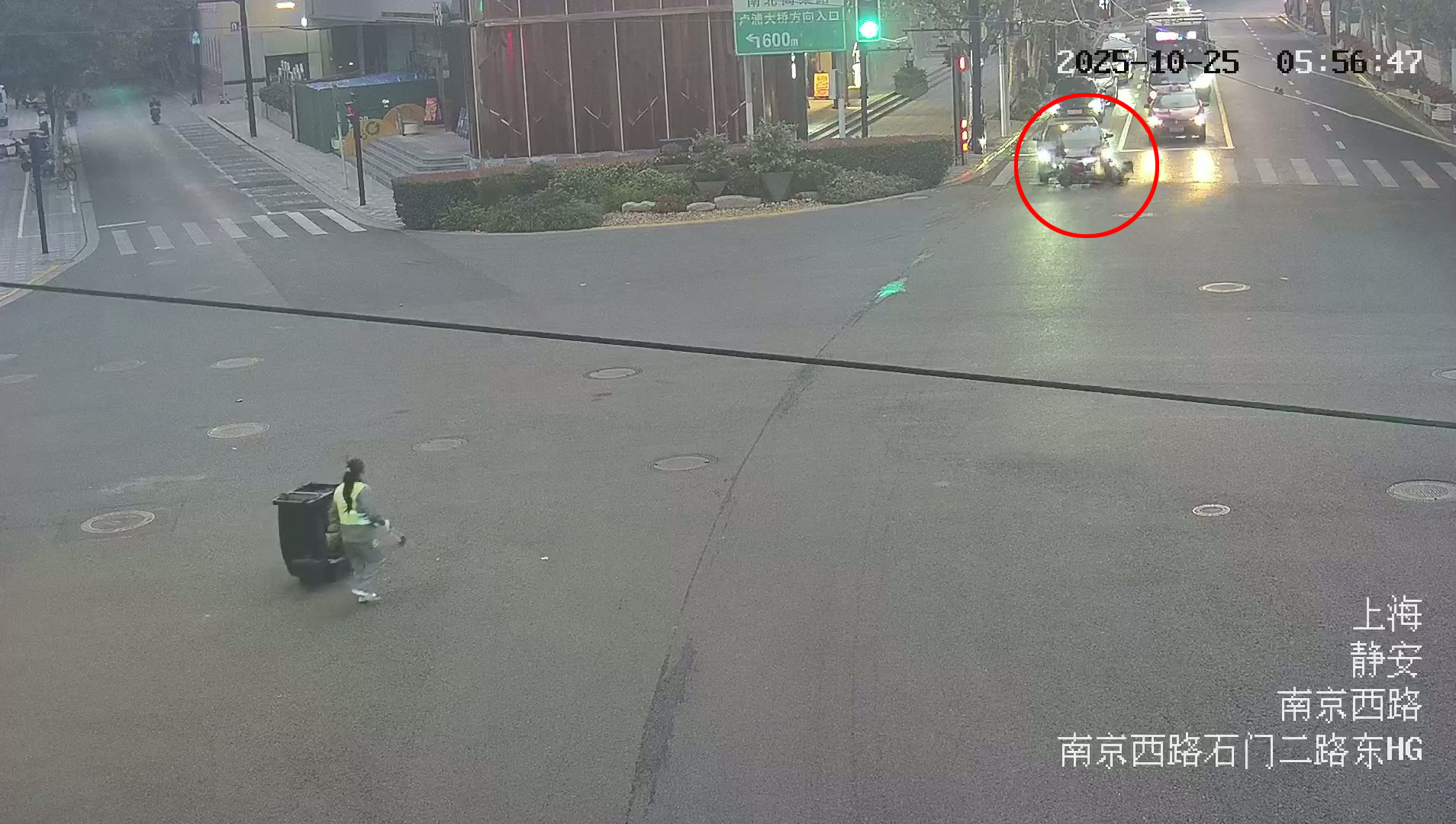 10月25日6时许,静安区石门二路南京西路路口发生一起碰撞事故。电动自行车驾驶人周某从附近小区驶出,为图方便选择直接横穿机动车道,继而逆向驶入对向车道。