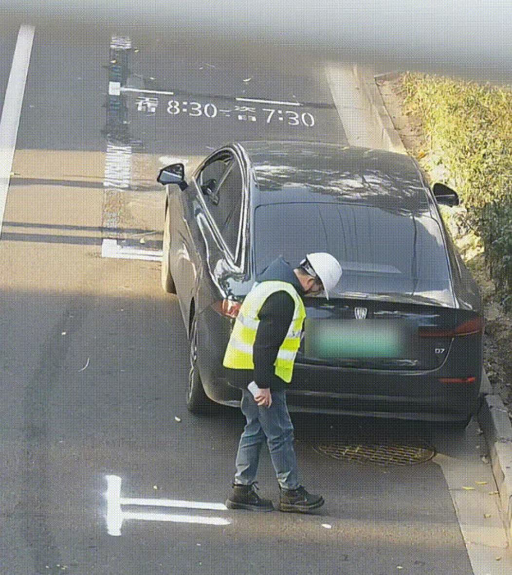 在回溯相关视频画面后,终于发现在10月28日下午,一名身着反光背心、头戴安全帽的男子使用白色喷漆在上述地点私自划设了两个车位,并将自己的车停进了其中一个自画车位上后离开。为了进一步调查清楚事情来龙去脉,民警张宾对违停车辆予以拖移,同时联系到车主季某,要求其尽快去徐汇交管支队事故审理大队接受处理。