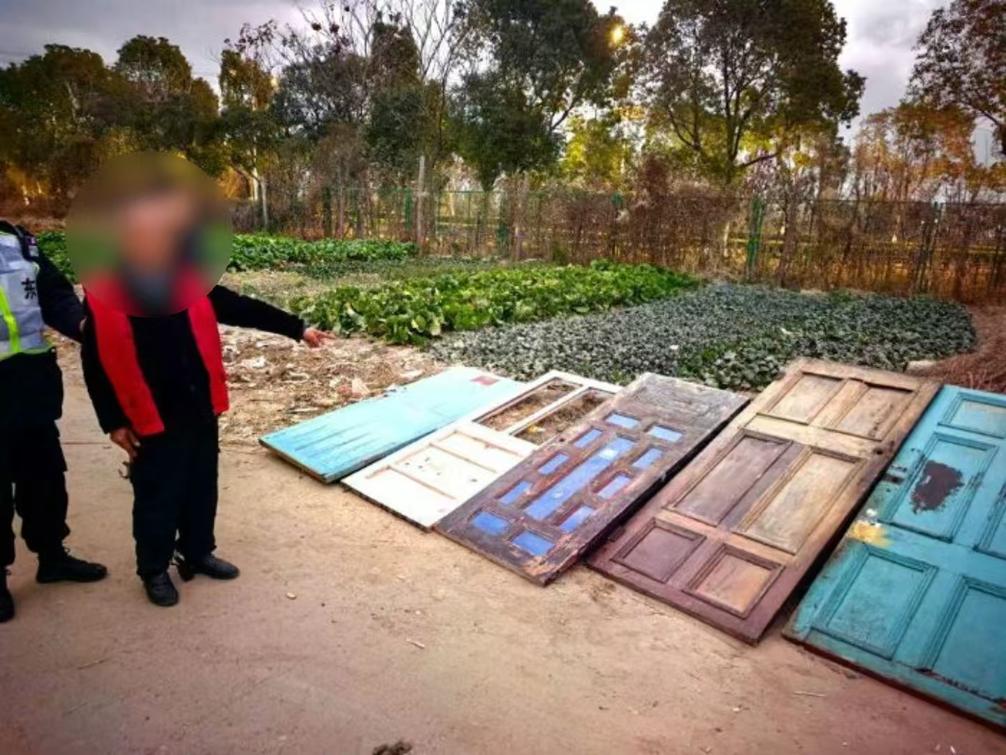 头图为五块门板、一根木梁,在拾荒者眼里是值180元的“废木料”。警方供图