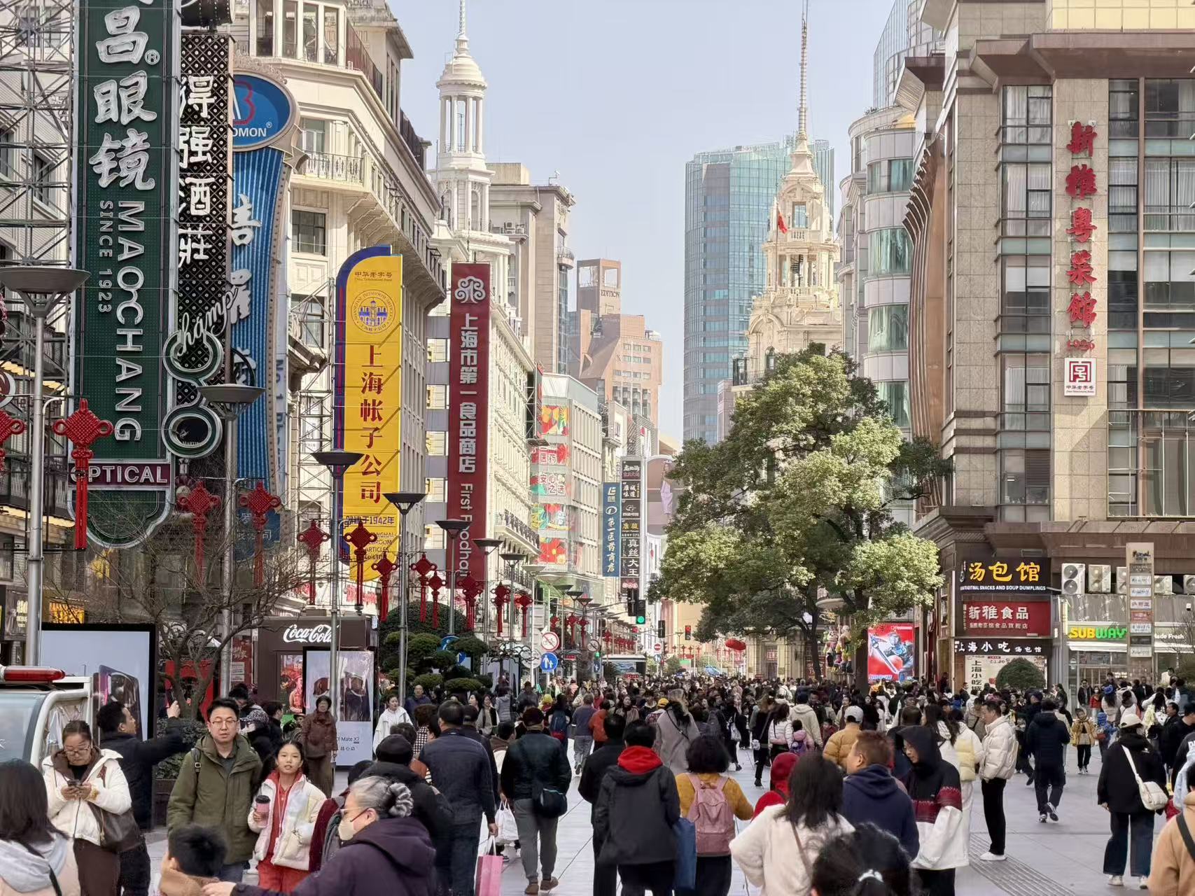南京路步行街上,中外游客摩肩接踵,沿街商铺年味浓郁,欢笑声此起彼伏。外滩、苏州河畔同样热闹非凡,市民或漫步滨水步道,或休憩闲谈,享受惬意时光。尽管假期接近尾声,沪上新春的热情丝毫不减,城市处处洋溢着欢乐祥和的节日氛围。