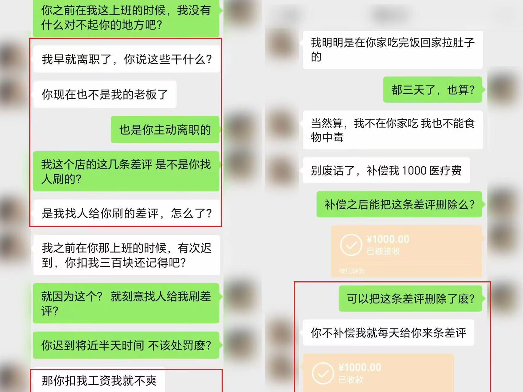 接报后,警方立即展开调查。经查,嫌疑人通常会虚构、伪造“仅退款不退货,否则给差评”“发个红包删差评”等商户与消费者间的聊天记录,并在申诉时上传这些带有“威胁、敲诈”性质的对话,旨在利用该平台审核机制的漏洞。例如,在某条申诉中,民警发现里面有多名“离职员工”恶意投诉商户的对话,而这些其实是嫌疑人“自导自演”的“一台戏”,是为了混淆事实、顺利删除差评。