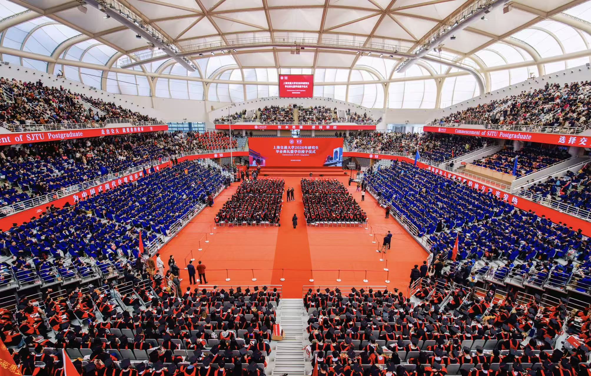 3月28日,上海交通大学2026年研究生毕业典礼暨学位授予仪式在闵行校区霍英东体育中心举行。校长、中国科学院院士丁奎岭深情寄语毕业生。校领导、教师代表、校友代表、各院系及部处负责同志、毕业生亲友代表等参加典礼,共同送别2026届研究生毕业生。3500余名学子获得学位,怀揣“饮水思源,爱国荣校”的嘱托,奔赴人生新征程。