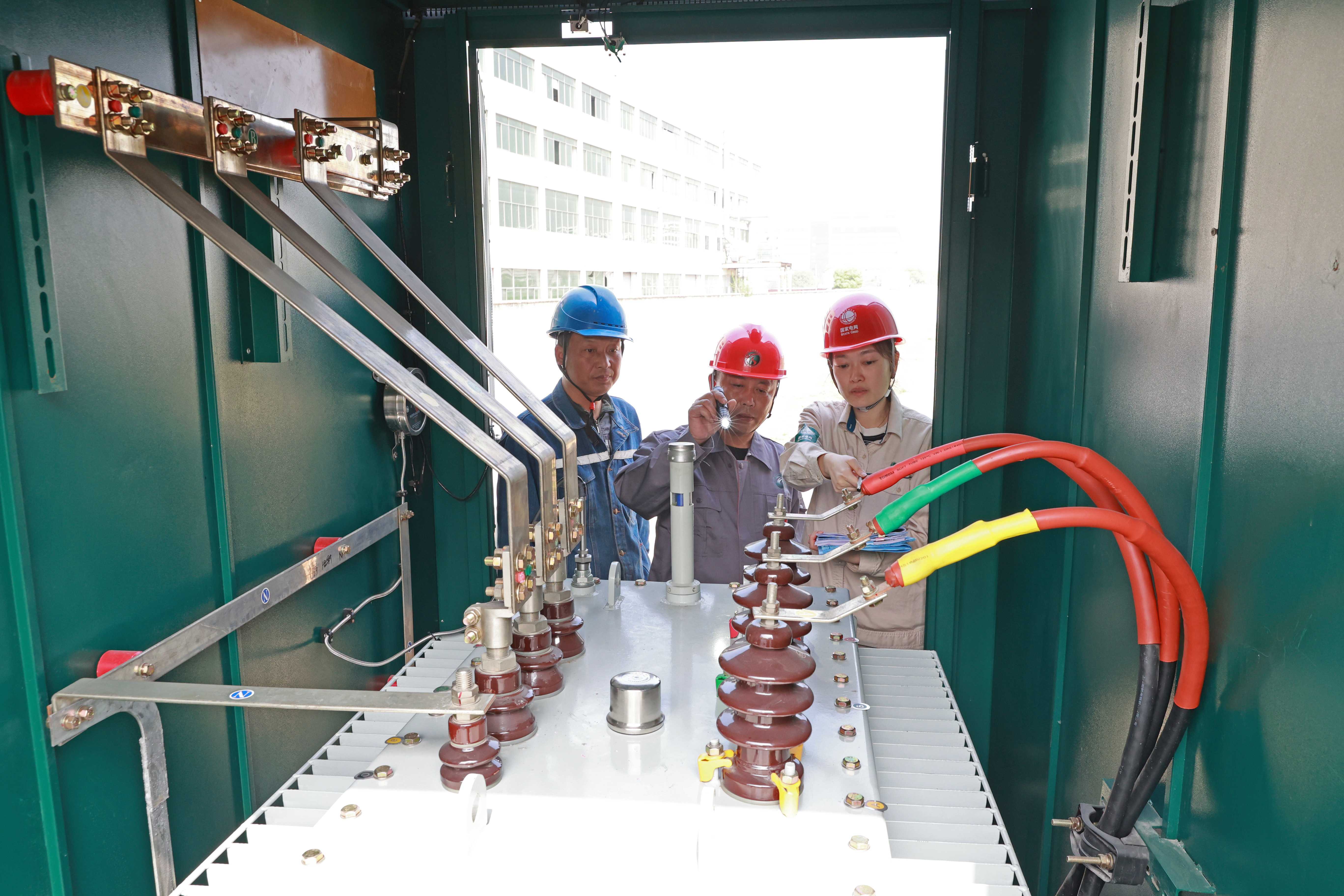 图为工作人员正在检查验收用户临时箱变。国网上海电力提供