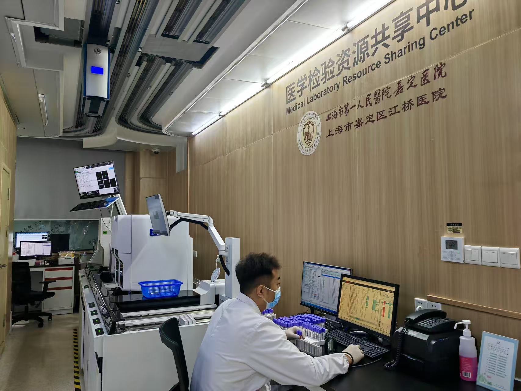 在江桥医院的医学检验资源共享中心,患者在社区抽的血样通过物流小车被送到这里接受检测分析。劳动报记者李蓓摄影