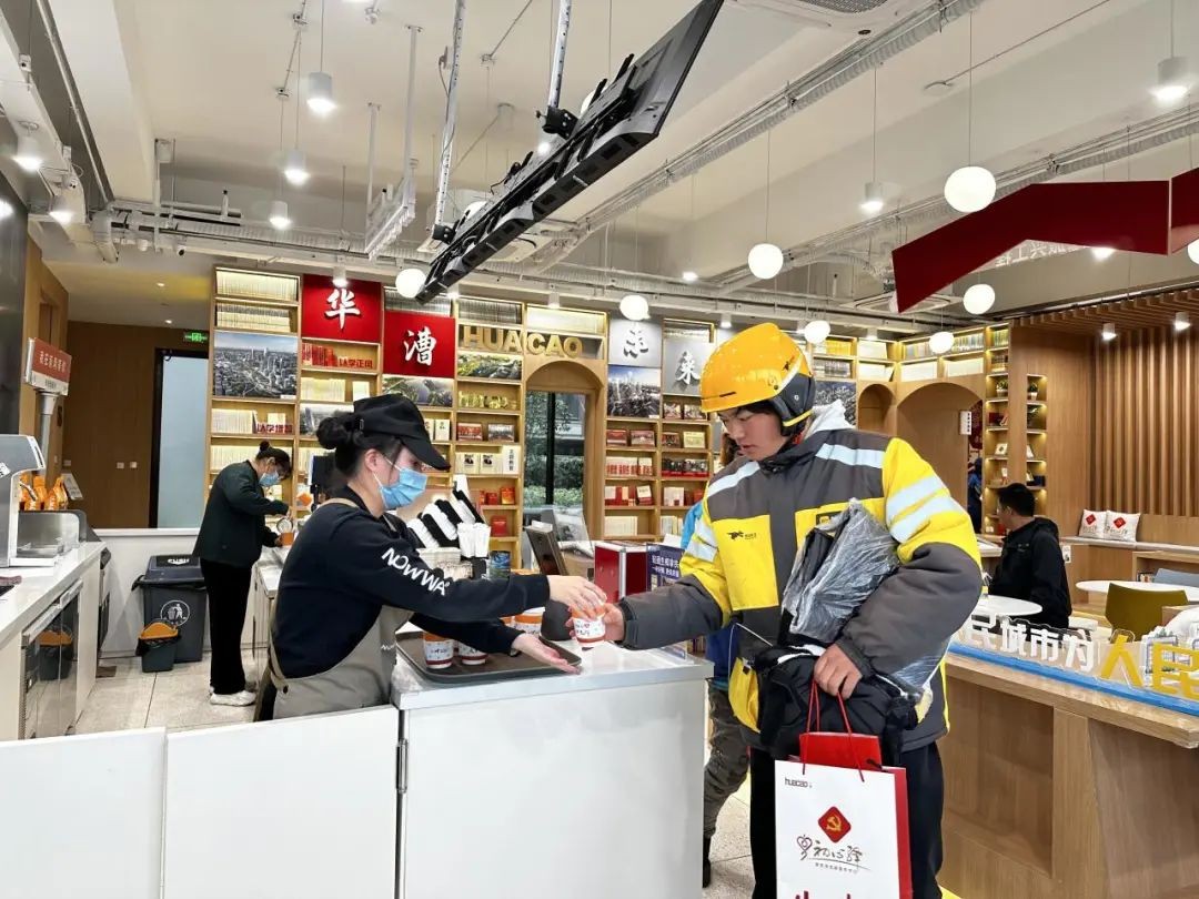 在党群服务中心,20名新就业群体了解了阵地为骑手们提供的暖心服务,包括休息、充电、热饭等;品尝了前湾的“先行”咖啡,一同观看华漕宣传片,感受前湾未来发展的温度和热度。