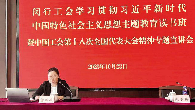 闵行区总工会举办的主题教育读书班暨中国工会十八大精神专题宣讲会上,来自强生制药的董姣姣作为中国工会十八大的基层一线代表分享体会。受访对象供图