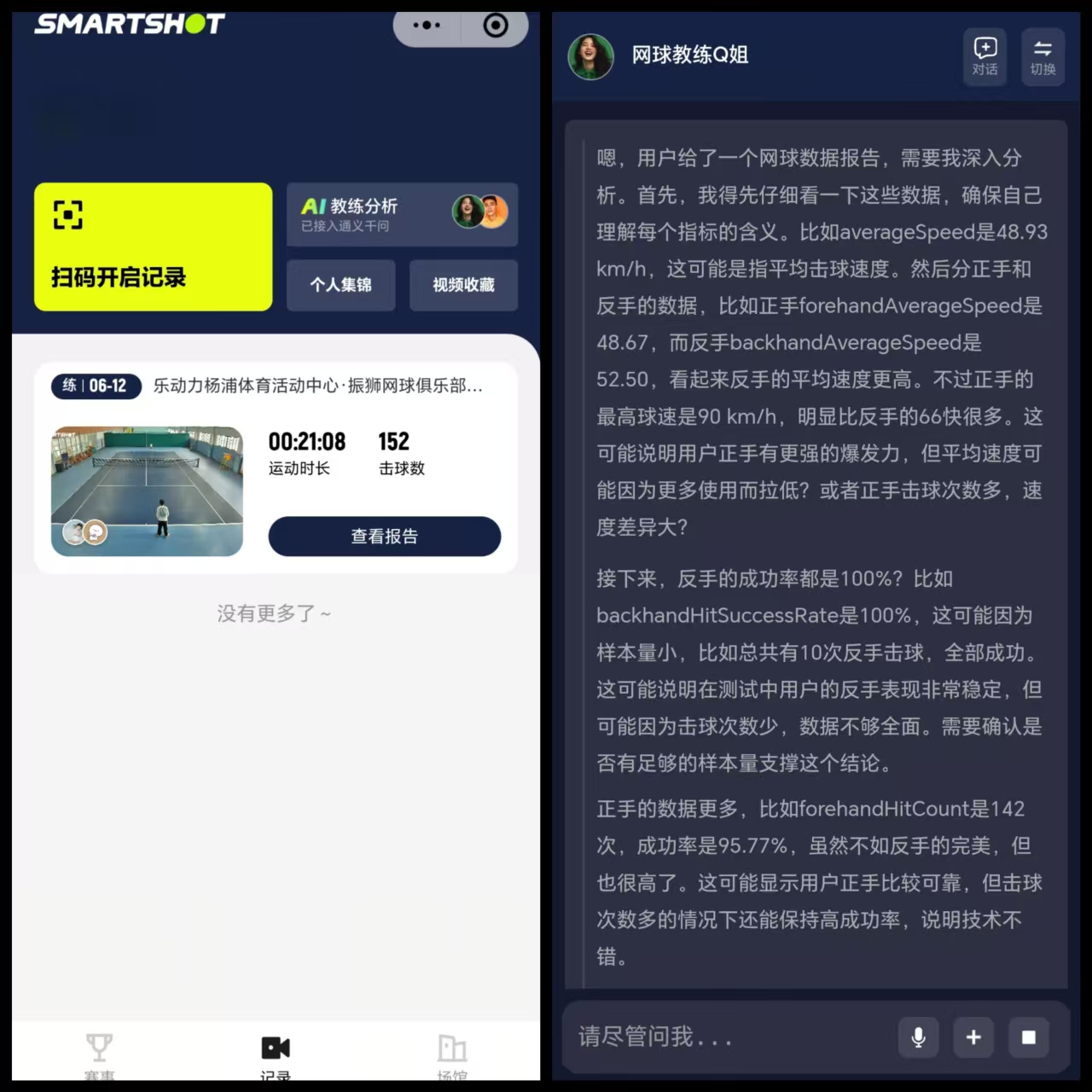 小袁一边演示一边告诉记者,这款AI还会化身网球教练Q姐,赛后只需问一句:“今天输在哪?”马上就能从多个角度进行相似的文字分析,“我还可以问他我应该补强的技术细节、动作技巧与网球明星的差距等,只要你能想到的网球问题,它都能给你解答,这比原来架个手机自己琢磨可好太多了。”
