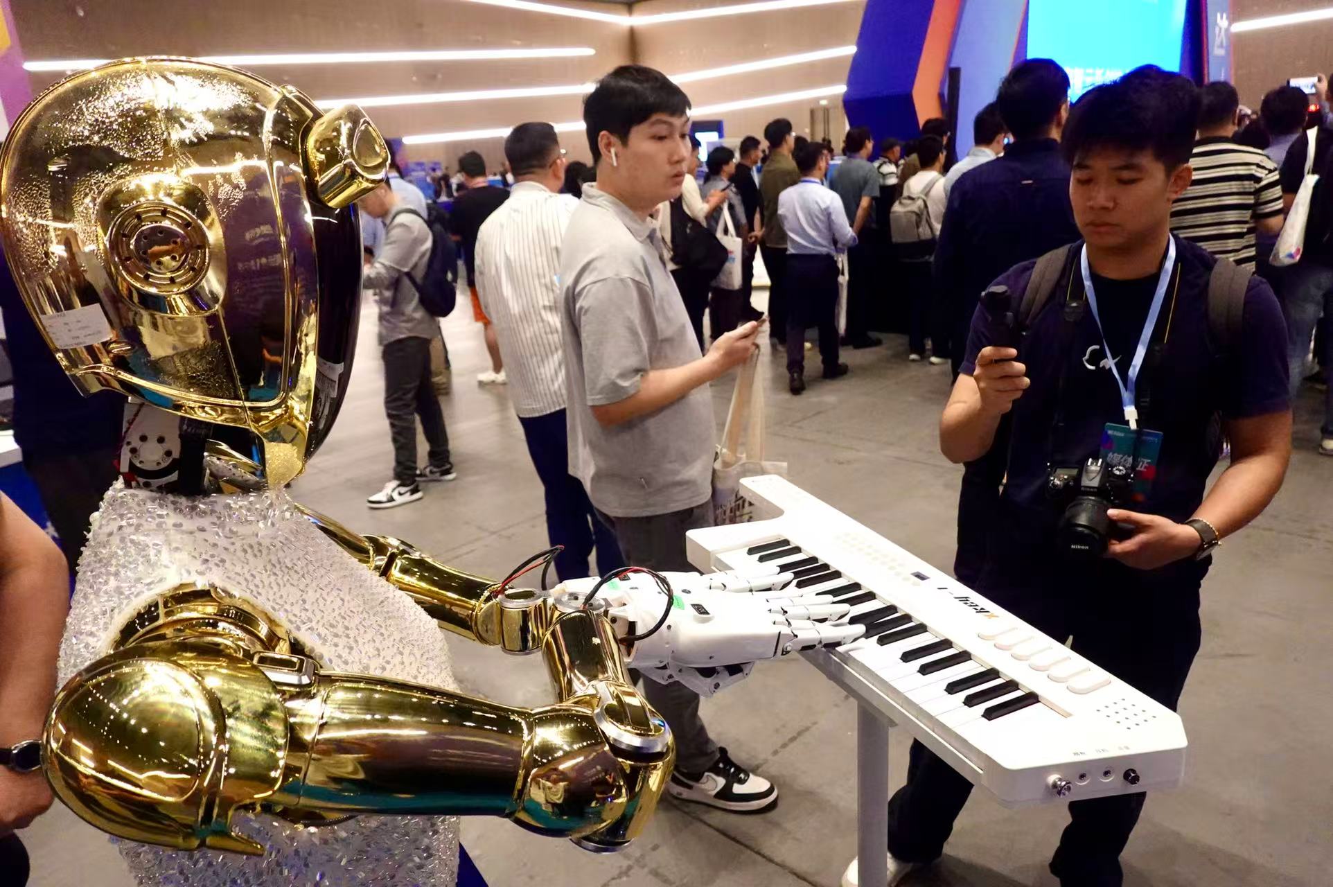 机器人在键盘上展示“灵活手”,观众惊喜地拿出手机拍摄,贡俊祺摄