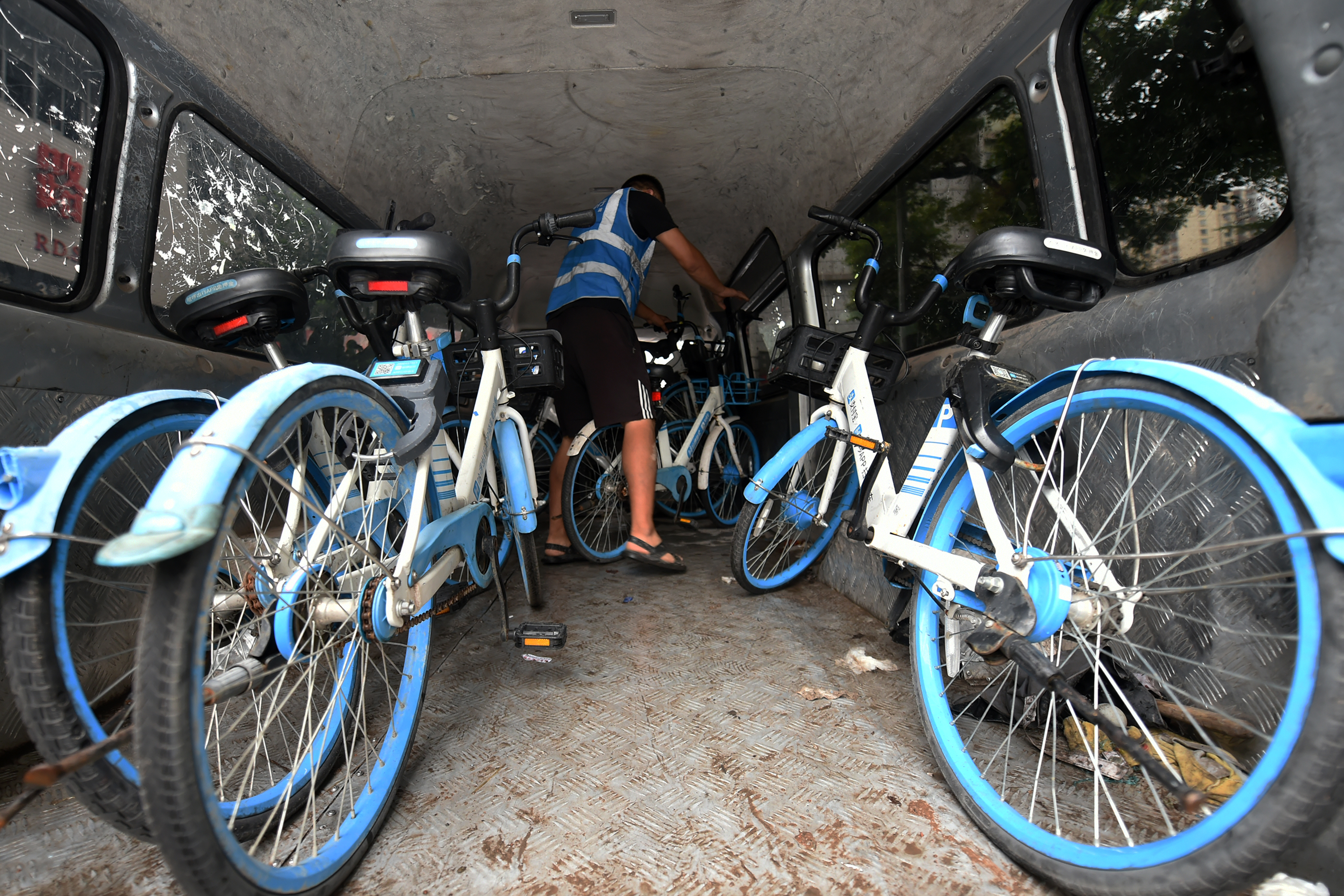 “一般中型面包车就是一人一车。能装得下50辆车的小型货车要配两到三个人。像吴师傅一个人的效率就已经很高了。”吴大胜所在的共享单车相关区域负责人周阳建介绍。