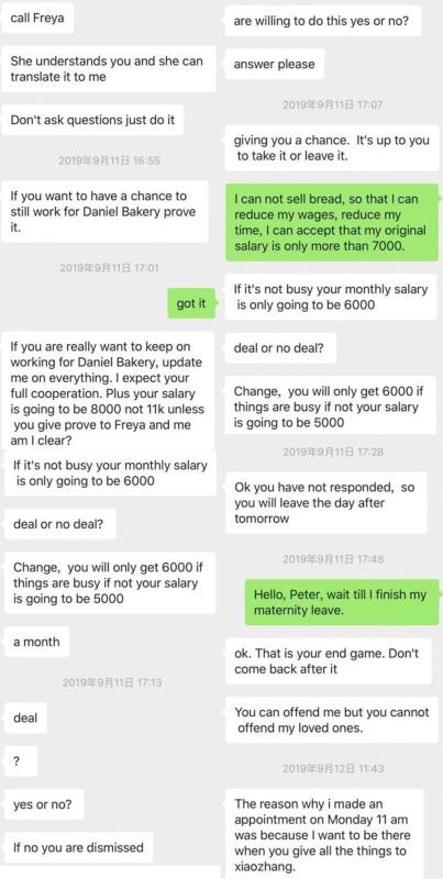 从邵女士与当时的外籍老板(现已更换)微信聊天记录看,2019年9月,老板对其工资产生质疑,认为其工资金额偏高,并随后多次口头下调其工资,并称“如果不同意则视为被开除”,后来更是要求邵女士明确回复是否同意每月5000元的工资,如不回复则同样视为不同意。仅仅在15分钟得不到回复后,老板要求邵女士后天“离开”,而邵女士则回复希望产假回来后再谈这件事。(双方微信对话原文为英文)
