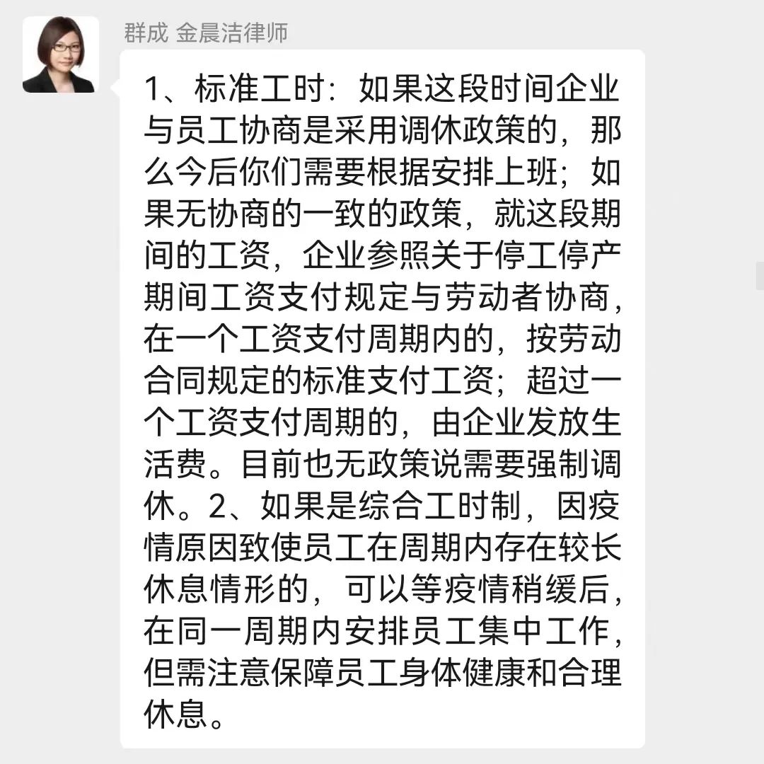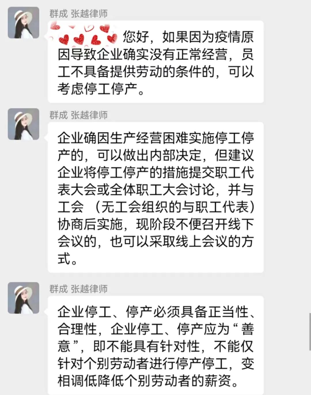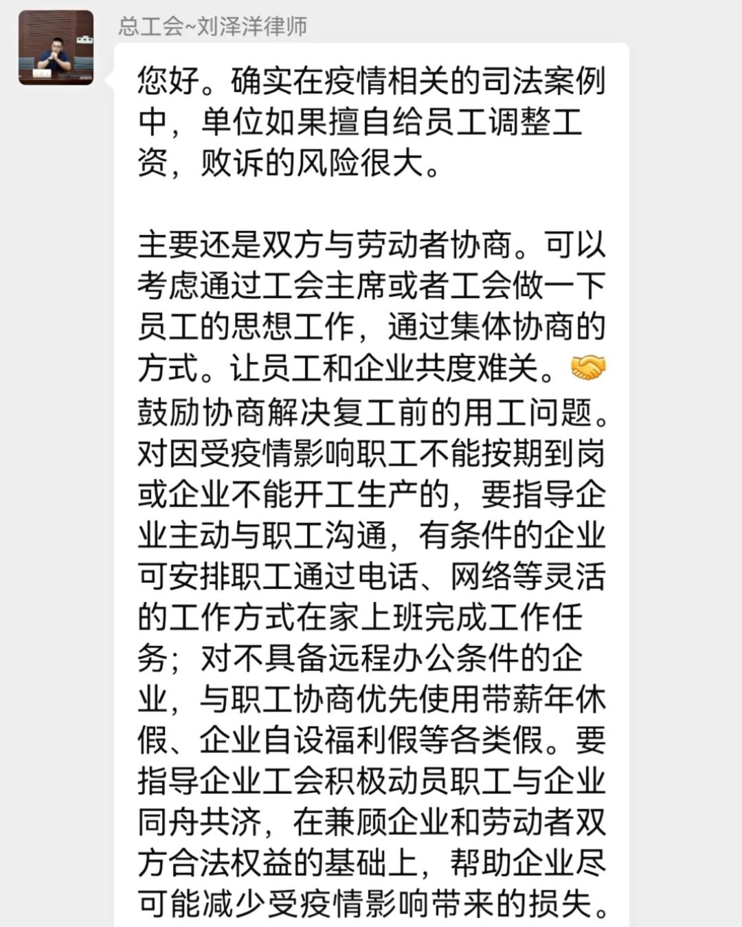 自4月5日“金山区职工(企业)疫情劳动法律问题解答微信群”建立以来,金山区总工会委托上海市群成律师事务所的志愿者律师们,共线上服务职工163人,企业96个,累计解答劳动用工法律问题近100个,为进群的区内职工和企业提供“零门槛”法律援助和咨询服务,让广大职工在关键时刻感受到工会“娘家人”的贴心关怀。