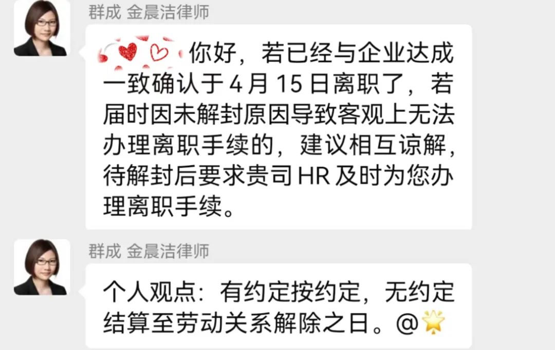 3、如果和员工约定好离职日期是4月15日,但是因为封控还没有办法离职,那是顺延还是什么?如果15号后还没解封,那至解封日期没有办理手续的那段期间需要支付工资吗?