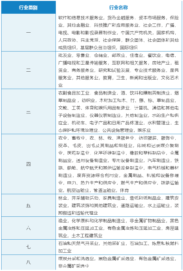 按照《国民经济行业分类》对行业的划分,根据不同行业的工伤风险程度,由低到高,依次将行业工伤风险类别划分为一类至八类。