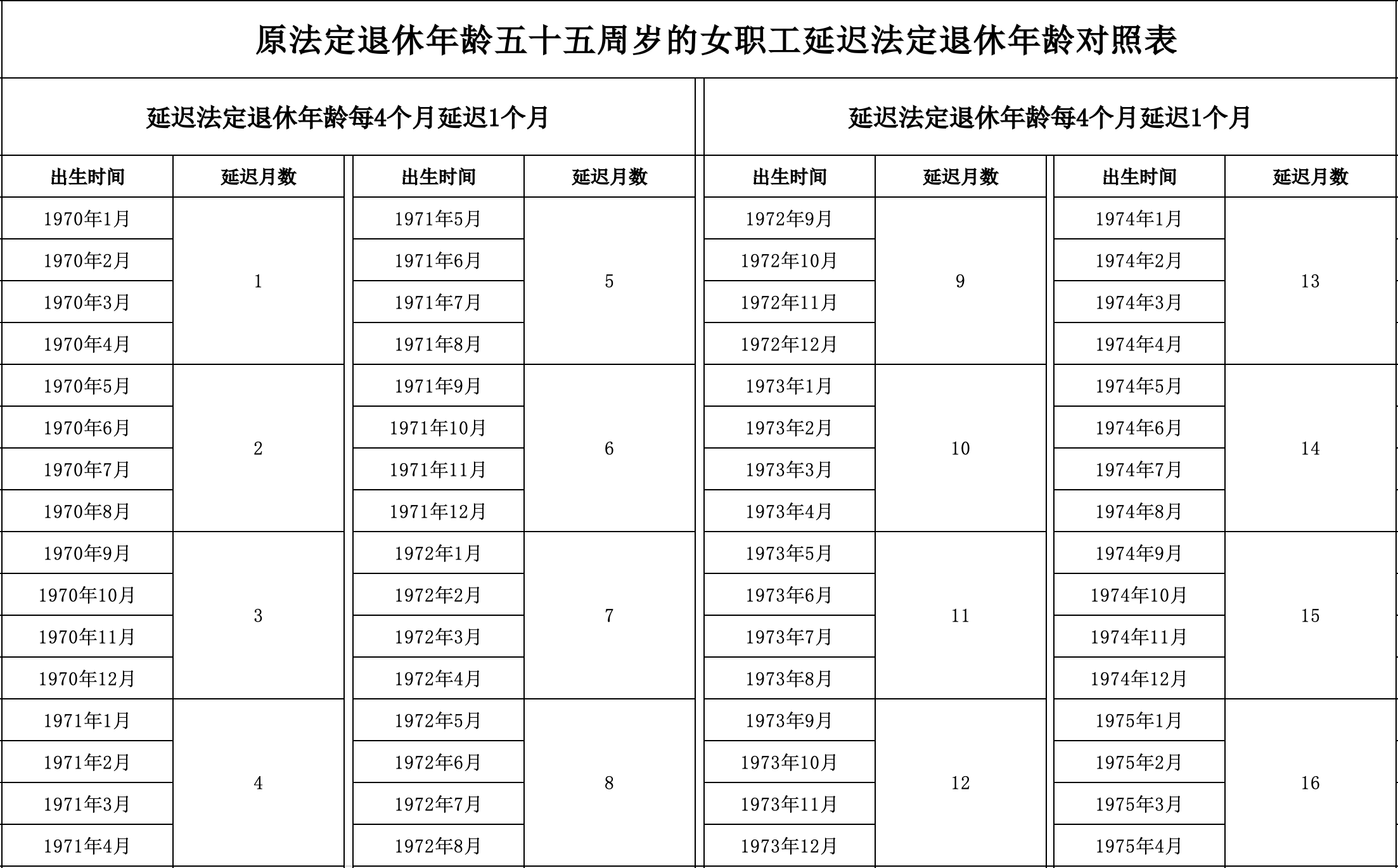 今年9月13日,《全国人民代表大会常务委员会关于实施渐进式延迟法定退休年龄的决定》正式发布,渐进式延迟法定退休年龄明年起施行。改革方案规定,原法定退休年龄为60岁的男职工和原法定退休年龄为55周岁的女职工,每4个月延迟1个月,原法定退休年龄为50周岁的女职工,每2个月延迟1个月。即,用15年的时间,逐步将男职工的法定退休年龄调整至63周岁,将女职工的法定退休年龄分别调整至58周岁、55周岁。