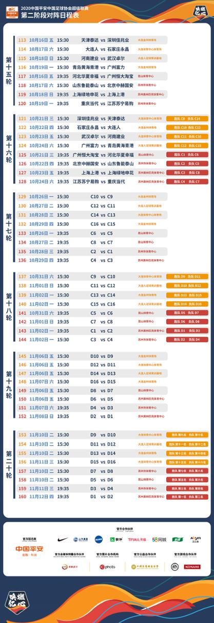 中超第二阶段将于10月16日在苏州、大连两大赛区正式打响,保级组的揭幕战在10月16日下午3点半进行,对阵双方为天津泰达和深圳佳兆业。广州恒大和河北华夏幸福则于10月16日晚上7点35分,拉开争冠组的序幕。