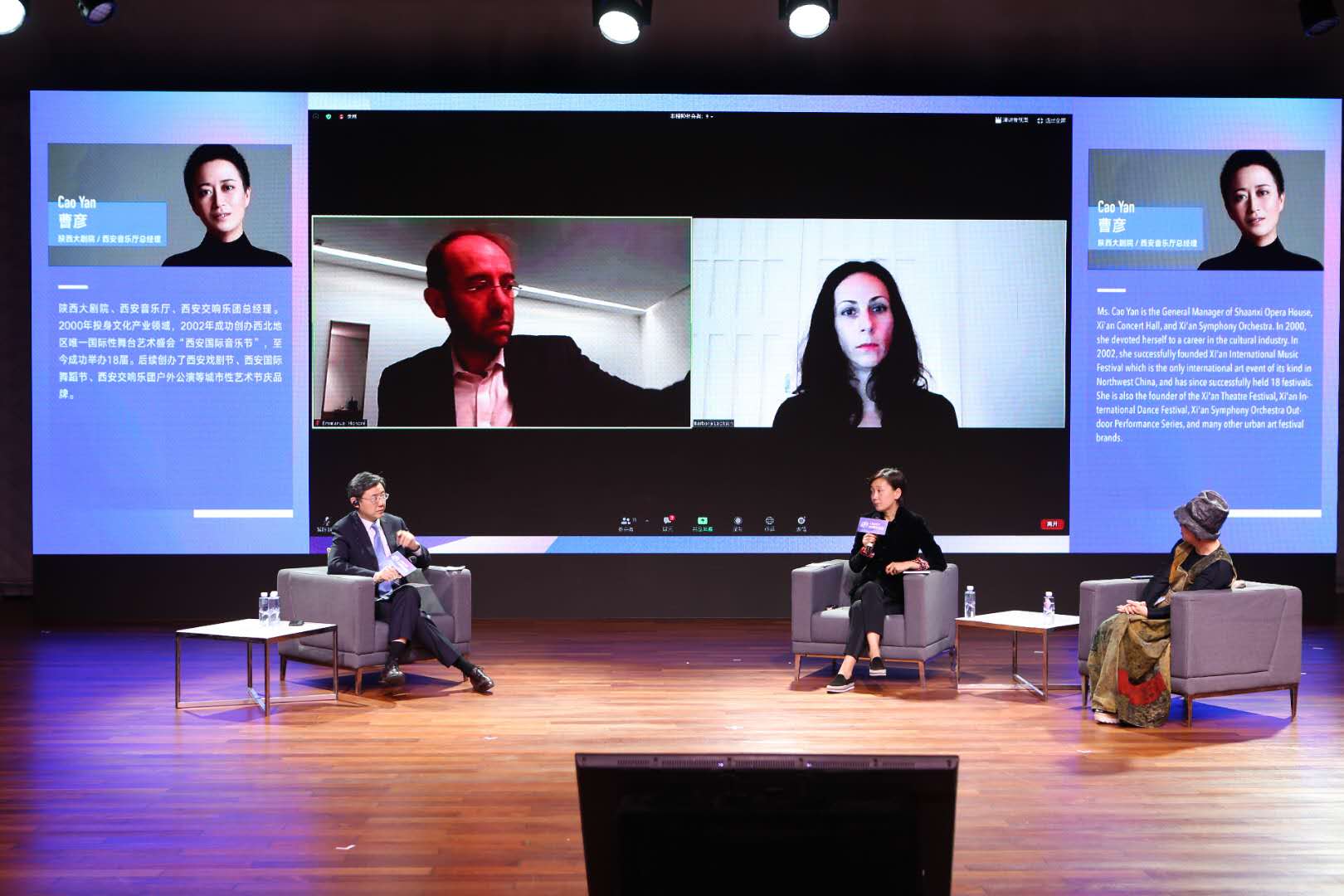 其中,第一场分论坛里,上海大剧院总经理张笑丁、陕西大剧院/西安音乐厅总经理曹彦、德国汉堡易北音乐厅节目总监芭芭拉·勒比奇、法国巴黎爱乐大厅艺术总监伊曼纽尔·洪德里围绕剧场发展与科技融合的新方向和可能性在云端展开了探讨。