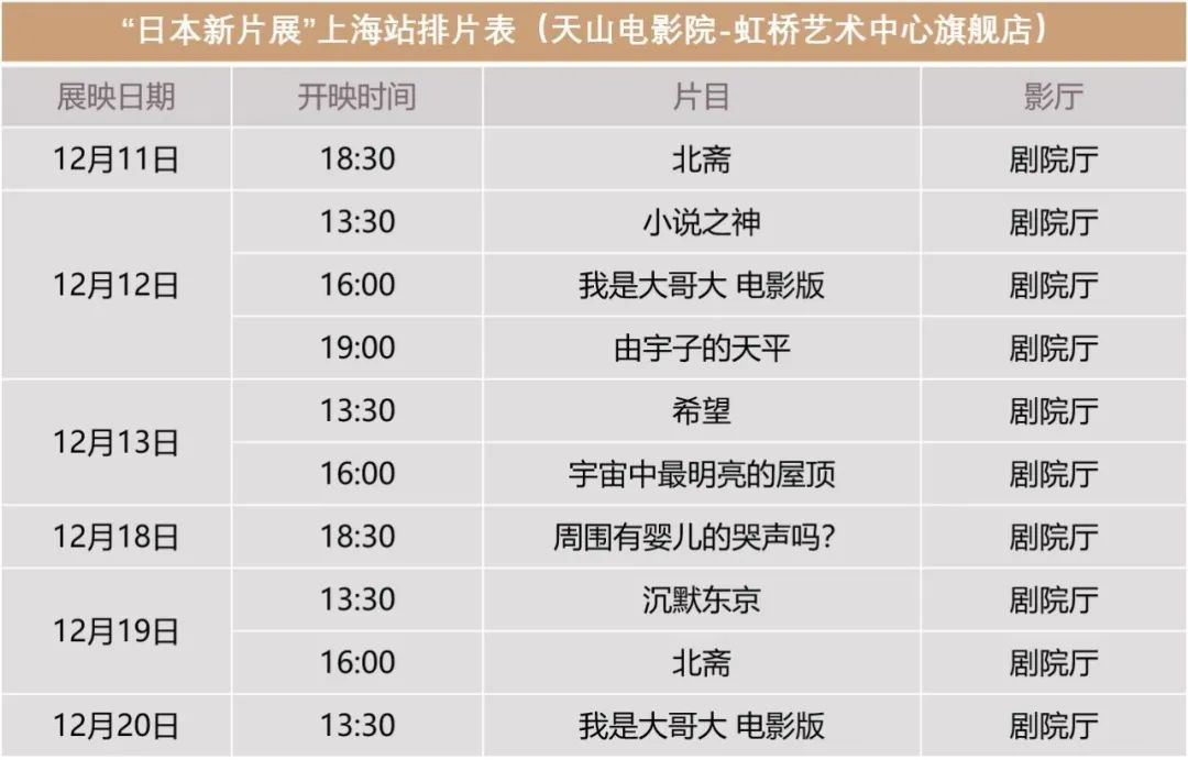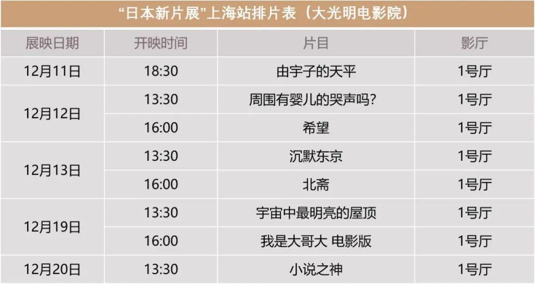 进入12月,上海的“周周有影展”活动迎来热门影展:日本新片展。12月11日,该影展将在上海率先拉开序幕。在影迷的千呼万唤中,上海站的排片表和开票信息正式公布。12月4日中午12点,“日本新片展”上海站将启动线上开票。