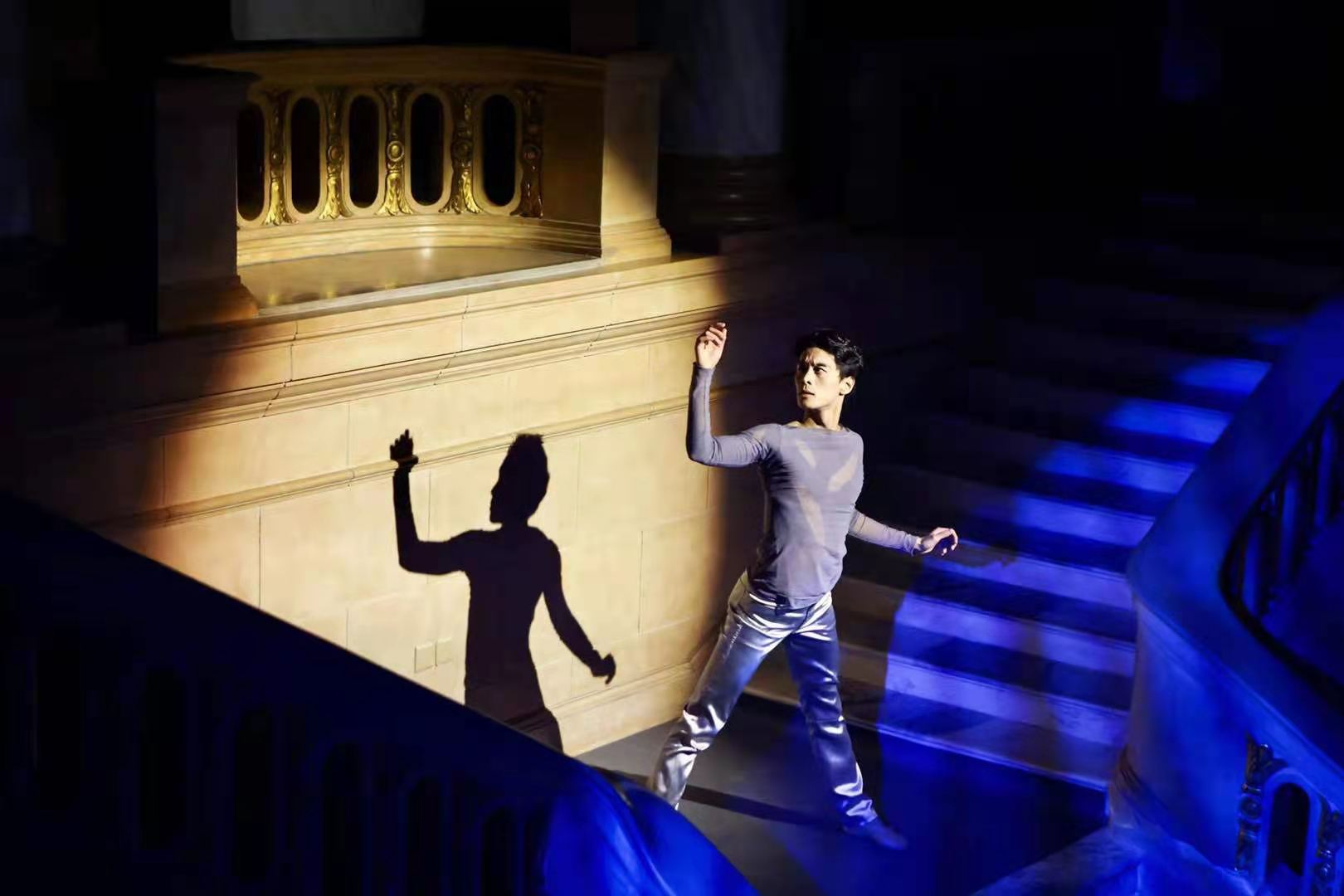 当晚,演出在优雅的手风琴声中缓缓拉开帷幕。上海音乐厅雕花穹顶下,由16根罗马柱环绕的汉白玉旋转楼梯上,上海芭蕾舞团首席演员、国家一级演员吴虎生优雅起舞。这里当晚的舞台之一,吴虎生舞步萦绕,当他缓缓走上旋转楼梯,观众也跟随灯光的指引移步到大厅二楼西侧的深邃长廊。