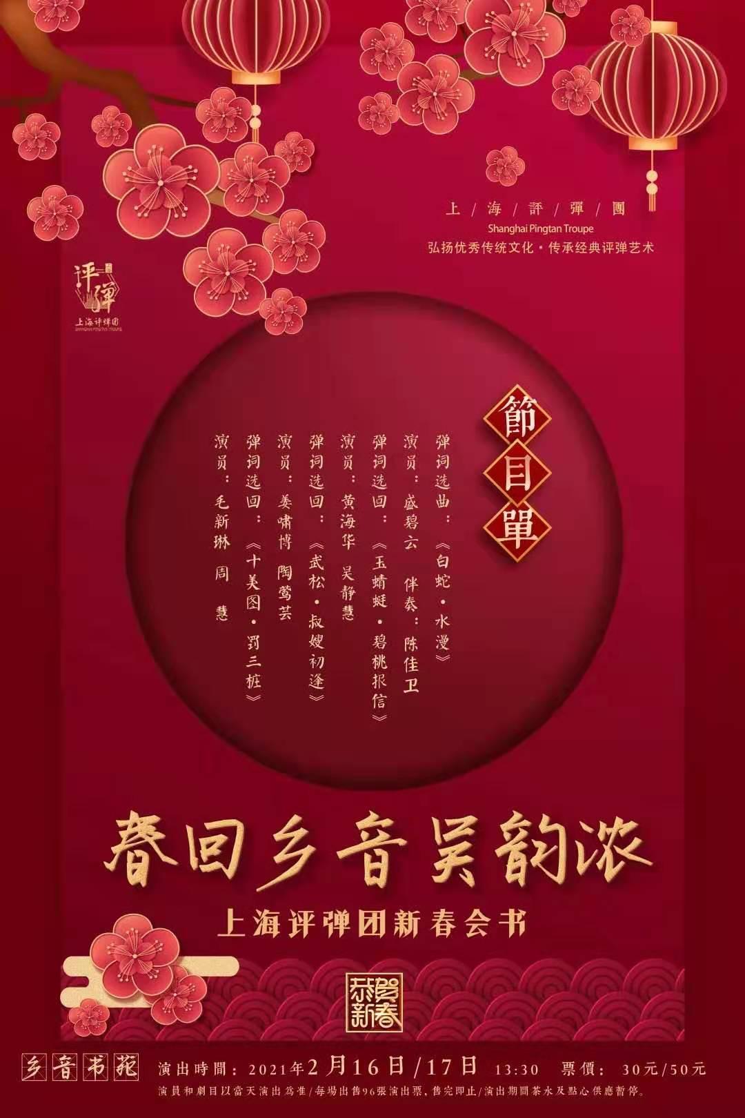 2月17日(初六),在上海评弹团抖音官方账号和哔哩哔哩官方平台还将同步直播《春回乡音吴韵浓——上海评弹团新春会书》节目。届时,观众不出家门,就可以欣赏到多场评弹演出。