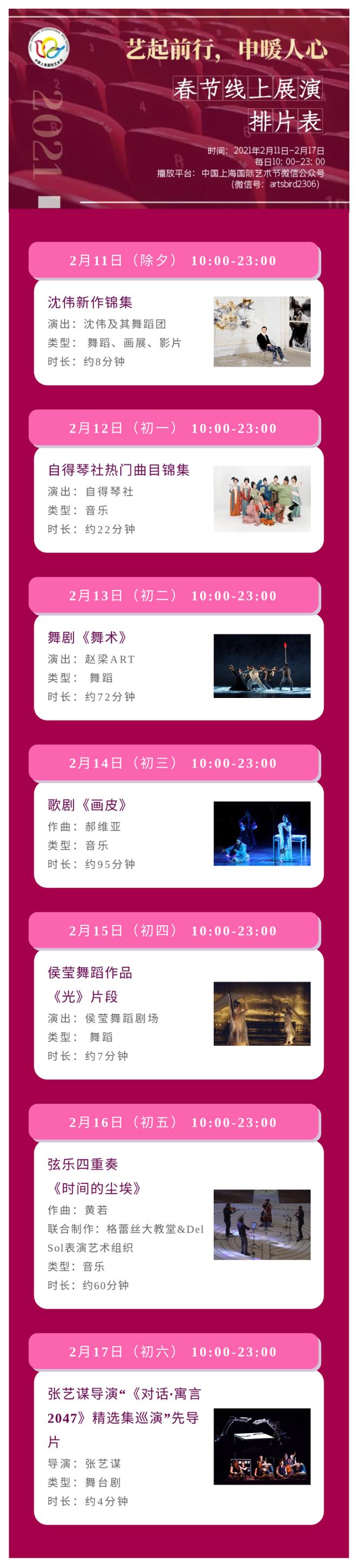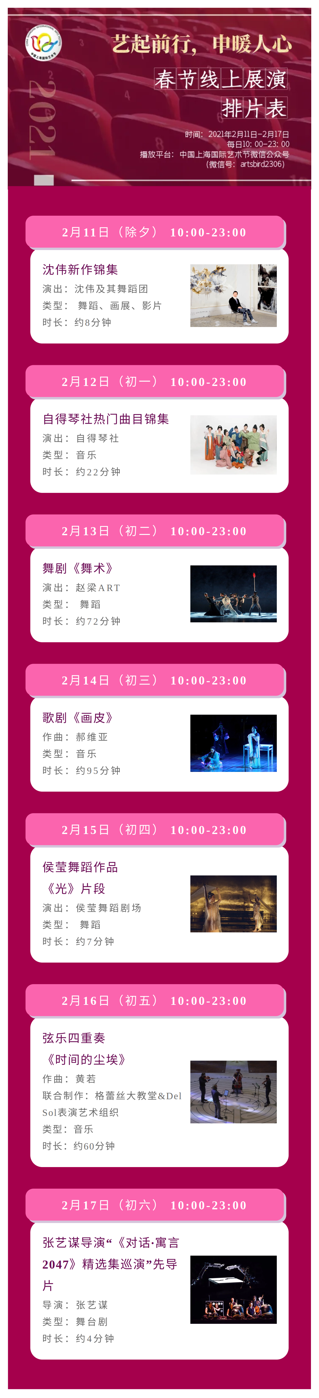 这个春节,疫情依旧没有远去,有人归乡,有人留沪度岁,中国上海国际艺术节中心挑选了七部精彩的艺术作品,从大年三十到正月初六(2月11日—2月17日),每天10:00-23:00,通过“中国上海国际艺术节”官方微信号限时播放,涵盖音乐、舞蹈、舞台剧等多种艺术形式,让艺术的力量在新的一年与大家继续“艺起前行”。