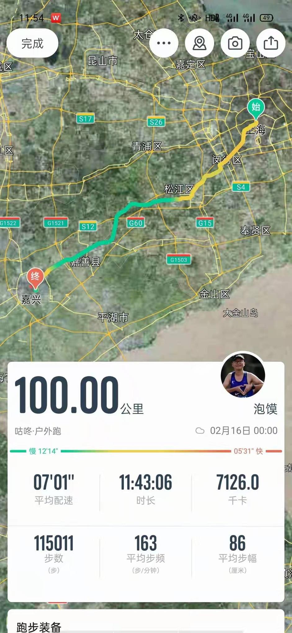 11时43分06秒,整整100公里,0701的配速,手机软件给出了一个堪称完美的跑步轨迹。中午时分,段鹏涛终于到达本次百公里挑战赛的终点。