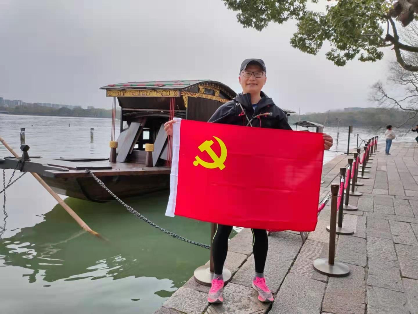 湖水碧波荡漾,红船静静停靠,早已准备好的党旗迎风展开,段鹏涛请人帮忙拍下了一张完赛照片。