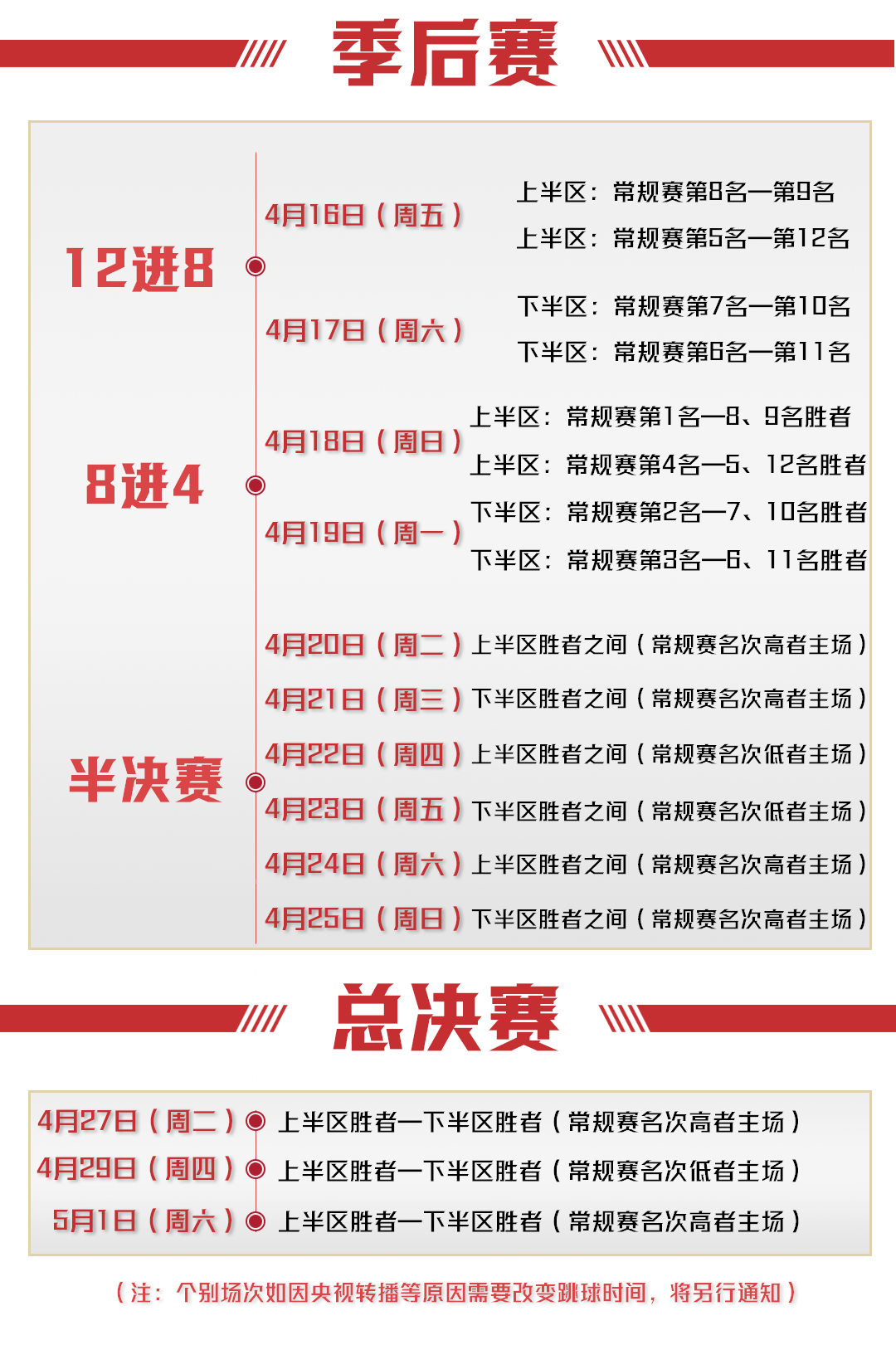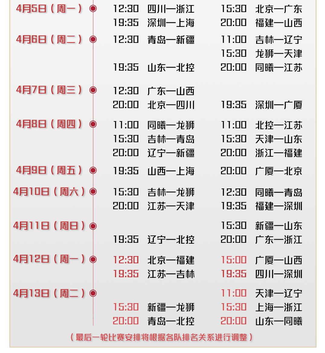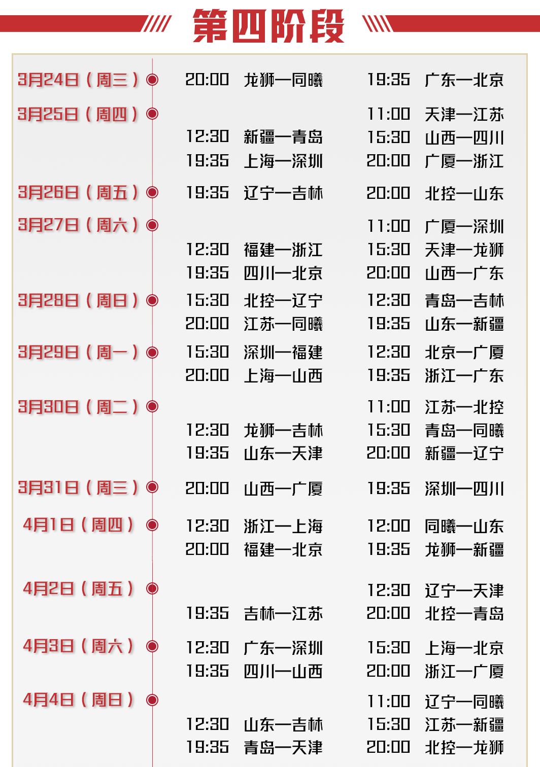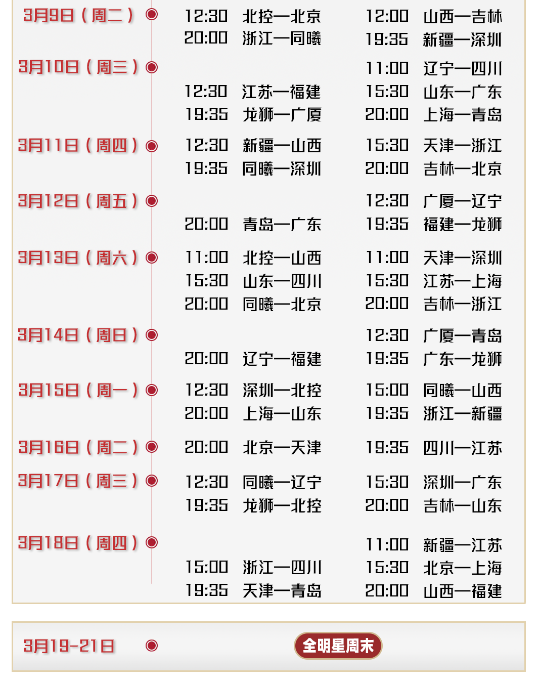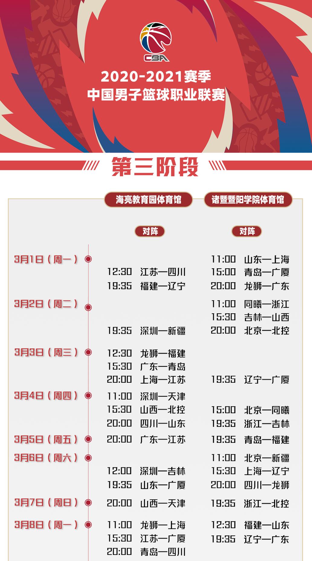 根据赛程,CBA常规赛第三阶段(第40-47轮)比赛时间为3月1日至3月18日,全明星周末时间为3月19日至3月21日。而常规赛第四阶段(第48-56轮)时间则为3月24日至4月13日,季后赛将从4月16日开始,总决赛最晚将于5月1日结束。为防控疫情,接下来的比赛仍将采用赛会制方式在浙江省诸暨市举行。