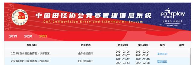 在此次公布的2021年赛事计划中,春节之后国内的第一项田径赛事将是3月6日在济南举行的2021年室内田径邀请赛(华北赛区)。6天过后,3月12日,室内田径邀请赛(西南赛区)还将在成都举行。目前,中国田协官网已经开启了这两项赛事的报名系统,这也意味着国内田径赛事即将重启。