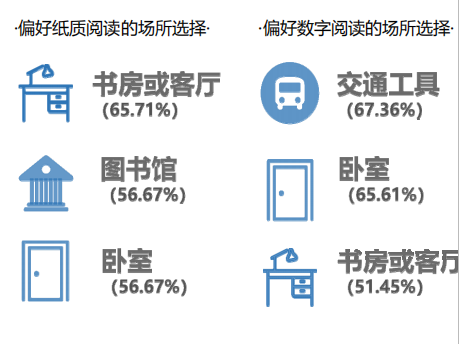 家庭成为市民阅读较为重要的场所:在不同阅读场所的选择上,“书房或客厅”“卧室”的占比均位列前三位。传统纸质阅读的群体中,书房或客厅(65.71%)的选择排在第一位。 数字阅读作为首要阅读形式的人群中, 排在第一位的阅读场所是交通工具(地铁、公交、火车、飞机等),可见,交通工具已成为市民数字阅读的重要空间。