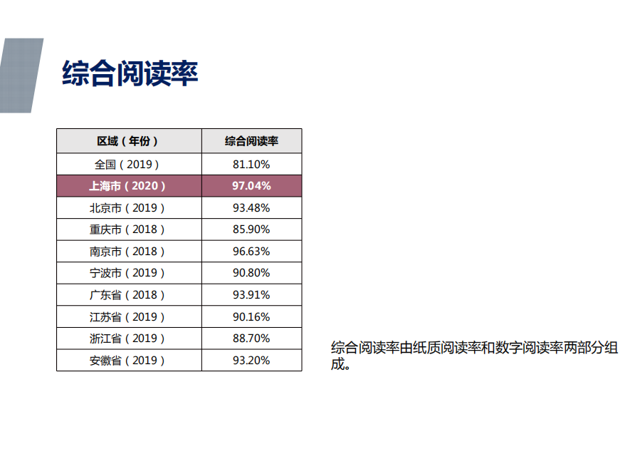 据《报告》,上海市民综合阅读率(即纸质阅读和数字阅读的人数占总人数的比率)达97.04%,高出2019 年全国国民阅读调查15.94个百分点。其中,纸质阅读率达96.05%,数字阅读率为99.52%。